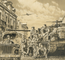 Paratroopers of the 101st Airborne lead American armored units through the recently liberated village of Saint Marie Du Mont during the advance from Utah Beach, shortly after D-Day. A pair of P-51 Mustangs pass low overhead as they support advancing troops nearby.