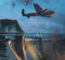 Robert Taylor’s sensational painting portrays the unfolding drama played out in the early hours of 17 May 1943. Guy Gibson and Mick martin have both made successful runs, and ‘Hoppy’ Hopgood, hit by the flak, has crashed in flames. The dam wall, however, has held firm. Now it was the turn of Melvin ‘Dinghy’ Young in Lancaster...
