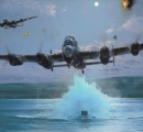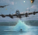 The fifth aircraft to attack the Möhne dam on the night of 16 / 17 May 1943, Flt.Lt. David Maltby powers Lancaster AJ-J away from the target as his Upkeep mine successfully detonates against the already damaged dam wall. Within seconds the dam will rupture releasing a terrifying wall of water flooding into the valley below.