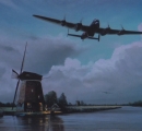 As his bouncing bomb scores a direct hit, Pilot Officer Les Knight powers his Lancaster over the Eder Dam, a huge deluge of water cascading over the fractured wall as he departs the scene.