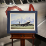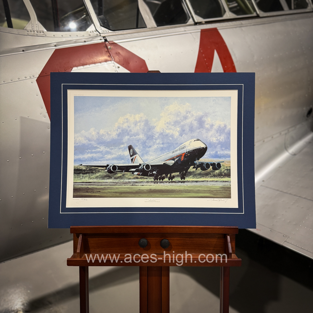 This detailed piece by Michael Rondot depicts the moment when a British Airways Boeing 747 Jumbo is hauling off Gatwick’s runway with a full load of passengers and fuel.