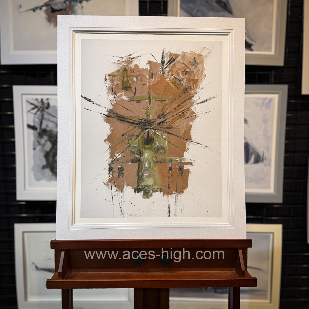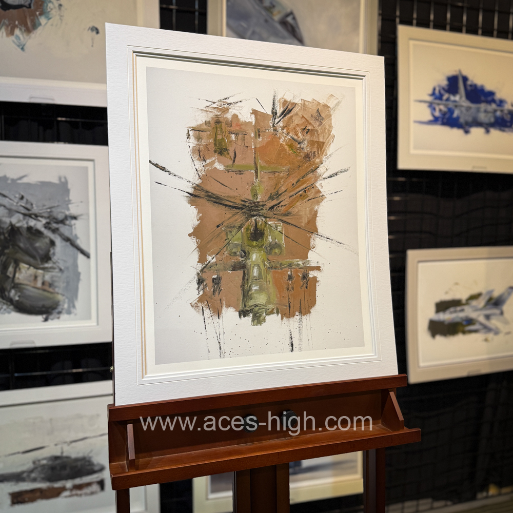 The Apache, rendered with bold, textured strokes from the palette knife, reveals its unmistakable, predatory form as it emerges from the canvas. Its angular surfaces catch the muted earth tones, echoing the rugged environments it was built to command. The composition remains minimalist yet powerful, distilling the helicopter to its essential geometry and the legacy it carries in modern military aviation. The overall effect is one of poised intensity, inviting the viewer to appreciate both the artistry and the enduring significance of this formidable aircraft.