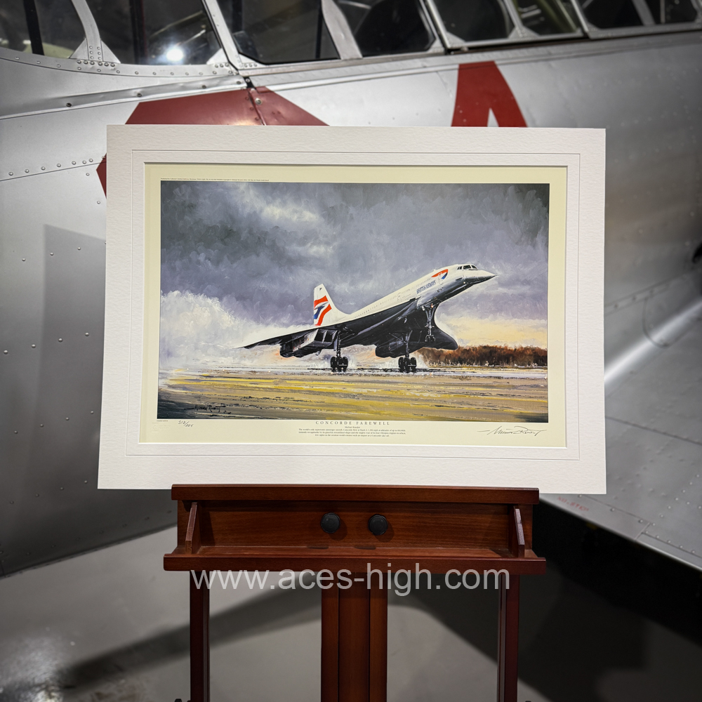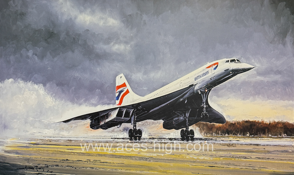 Combining grace and beauty with sheer awesome power, the unmistakable shape of Concorde is dramatically illustrated here in the style immediately recognizable as that of Michael Rondot. Concorde Farewell is a tribute to this amazing aircraft as she went into retirement in November 2003.
