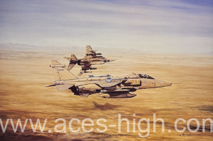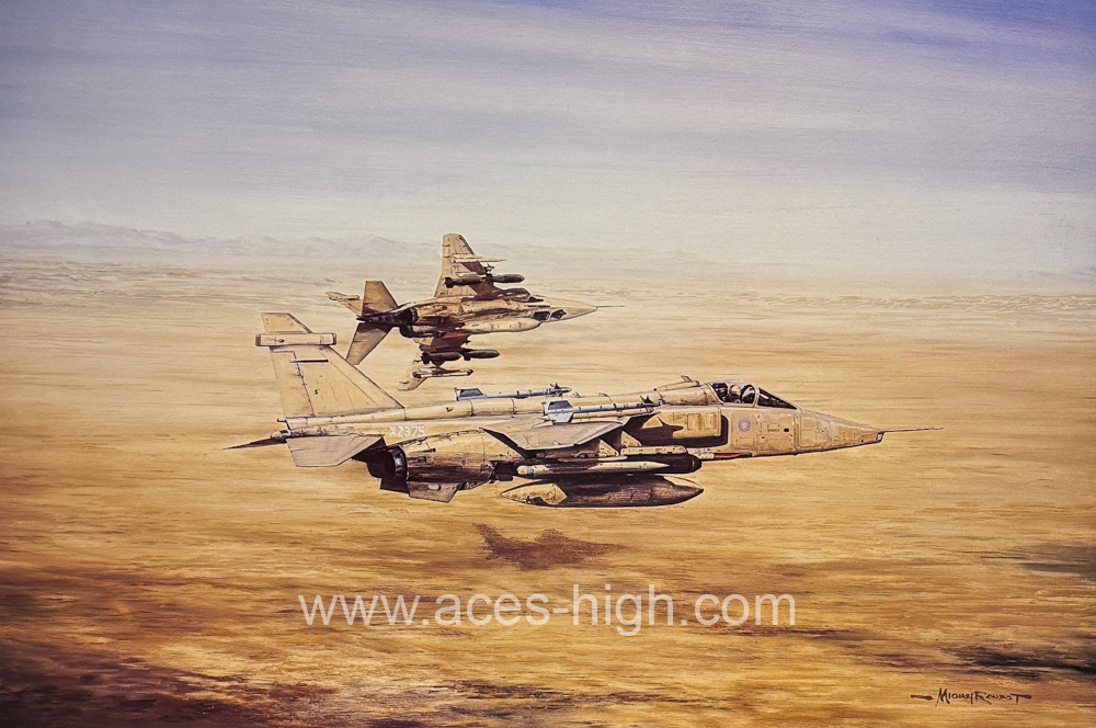 Michael Rondot's painting captures the speed and excitement of low-level operations as a pair of Jaguars loaded with 1000 lb Bombs and BL755 Cluster Bombs break formation and head down to the desert floor on a typical sortie. Each print in the edition is individually signed by 25 pilots from the RAF Coltishall Jaguar squadrons including all 3 squadron commanders. It is a great tribute to the engineers, pilots and the Jaguar aircraft itself, which proved so reliable and effective during these Operations.