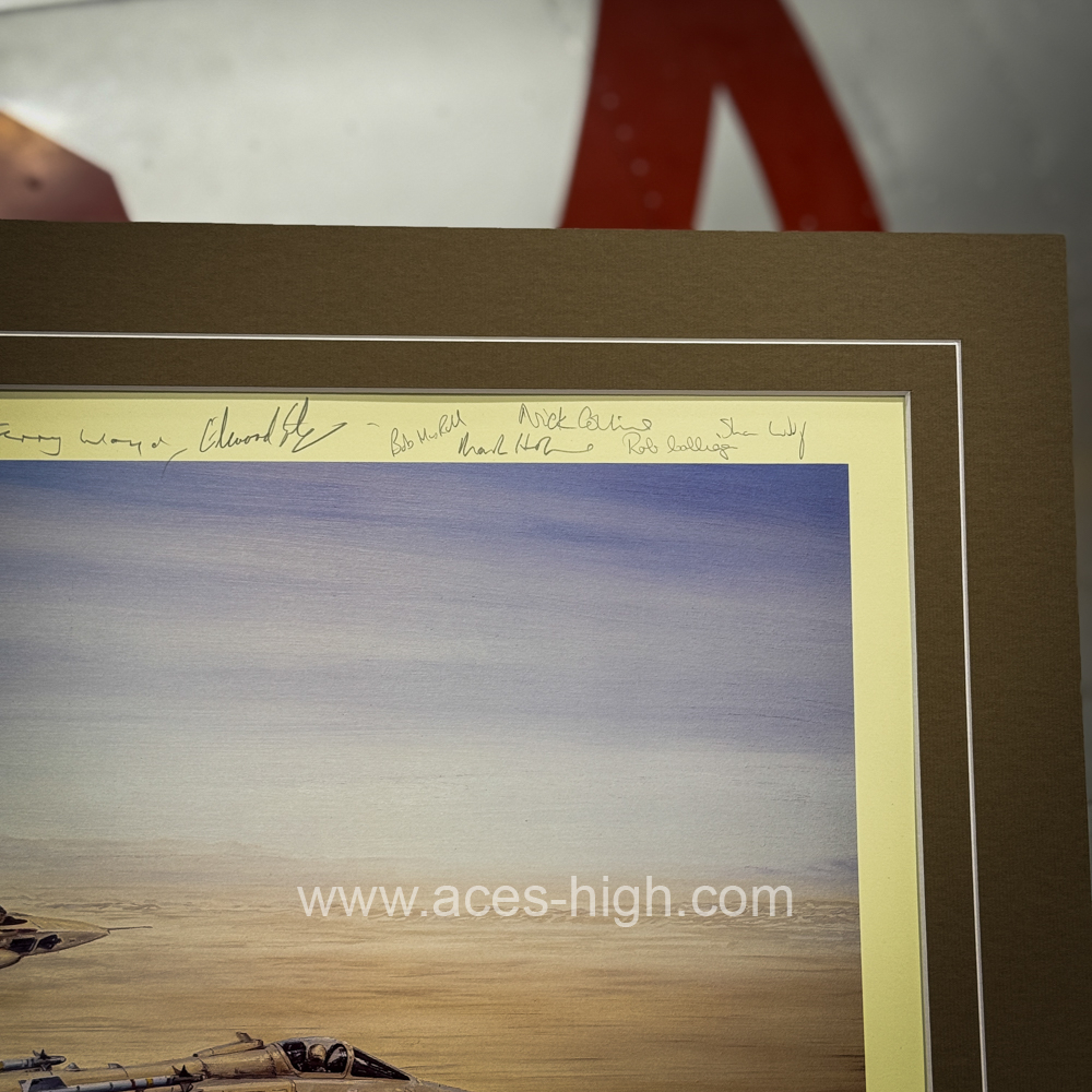 Each print in this edition has been signed by the artist (and Jaguar pilot) Michael Rondot but also a staggering TWENTY-FOUR Jaguar pilots who flew on Operation GRANBY, Operation DESERT STORM and Operation WARDEN.