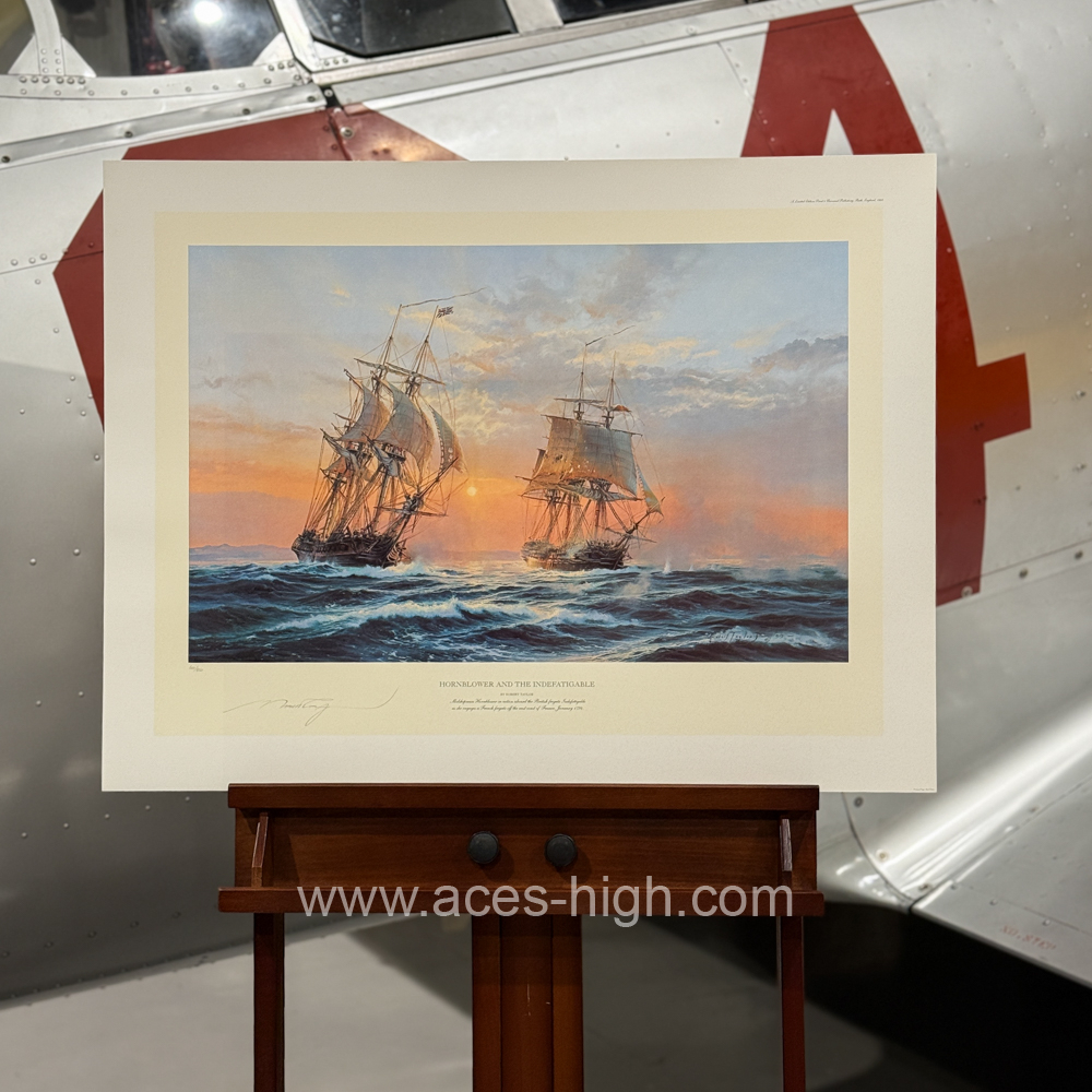 Robert Taylor, a maritime painter of extraordinary ability, was also inspired when he created ‘Hornblower & the Indefatigable’, capturing with great authenticity the duel between the young midshipman’s frigate and a French frigate.As the eighteenth century drew to a close, the young midshipman Hornblower found himself assigned to the Royal Navy frigate HMS Indefatigable on blockade duty off the west coast of France, ready to pounce on any French ship unwise enough to venture out to sea. Tossed around in stormy seas it was a cold, wet and uncomfortable billet for the sailors of the Royal Navy, but when called into action no one fought better. Such was occasion when Hornblower’s frigate, commanded by Captain Pellew, caught a larger 40-gun French frigate attempting to break out one cold January day. With yards groaning and gun trucks squealing, the determined Captain Pellew lays his ship close to the wind and engages the Frenchman. Needless to say the Royal Navy was triumphant, the enemy was boarded and taken as a prize of war.