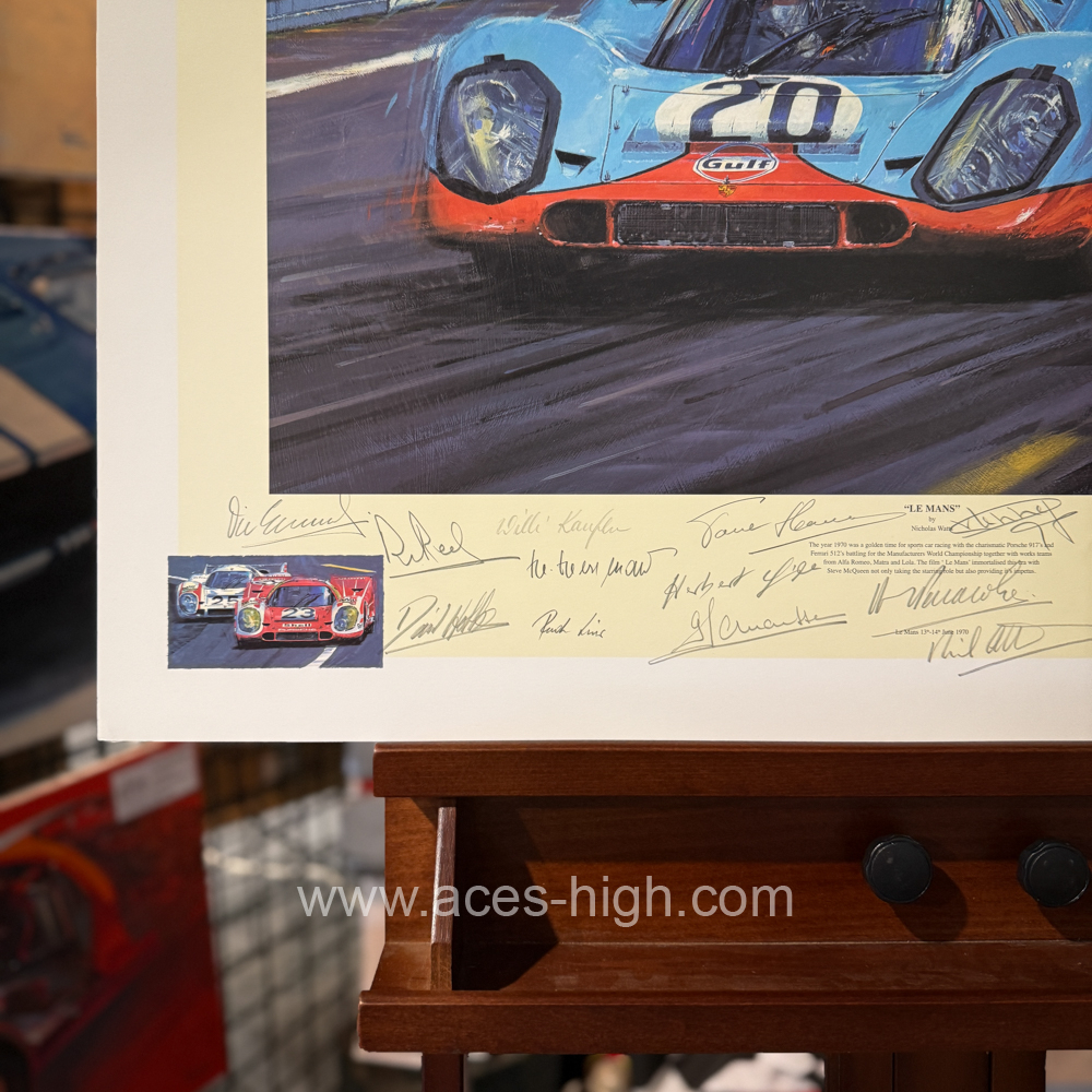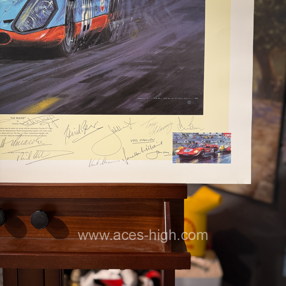 Signed by 21 of the participating drivers and actors: Brian Redman, Jacky Ickx, Derek Bell, Hans Herrmann, Tony Adamowicz, David Hobbs, Herbert Linge, Vic Elford, David Piper, Richard Attwood, Jonathan Williams, Sam Posey, Rudi Lins, Kurt Ahrens, Gerard Larrousse, Hal Hamilton, Toni Hezemans, Henri Pescarolo, Willi Kahausen, Gijs van Lennep and Chad McQueen!