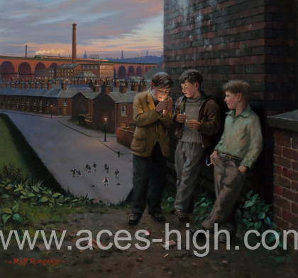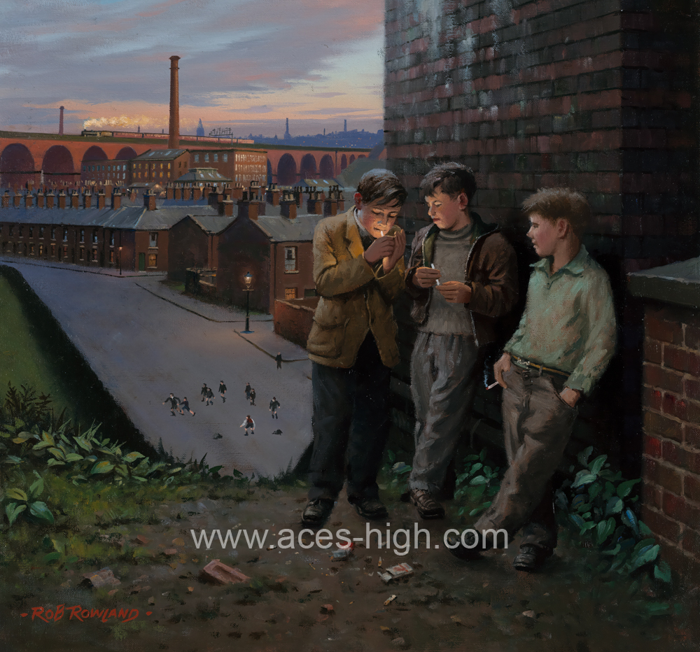 This piece depicts three boys up against a building on a hill smoking cigarettes with the cityscape in the backround and a steam train passing by in the far distance.