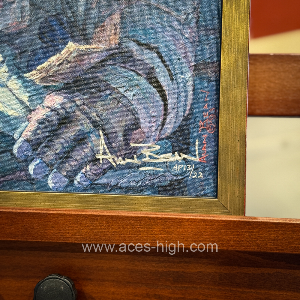 Since Alan left the space program and became an artist, he had thought differently about life. He missed Jim a lot and respected him as the brother he never had, as he knew he always had his back. Because of this, after his passing Alan dedicated this piece to his great friend Jim Irwin.This Artist Proof Giclee has a very rare 3D effect to it as it has the foot print from one of Alan’s boots embedded into the texture of the giclee. This piece has been personally signed and numbered by Alan himself.