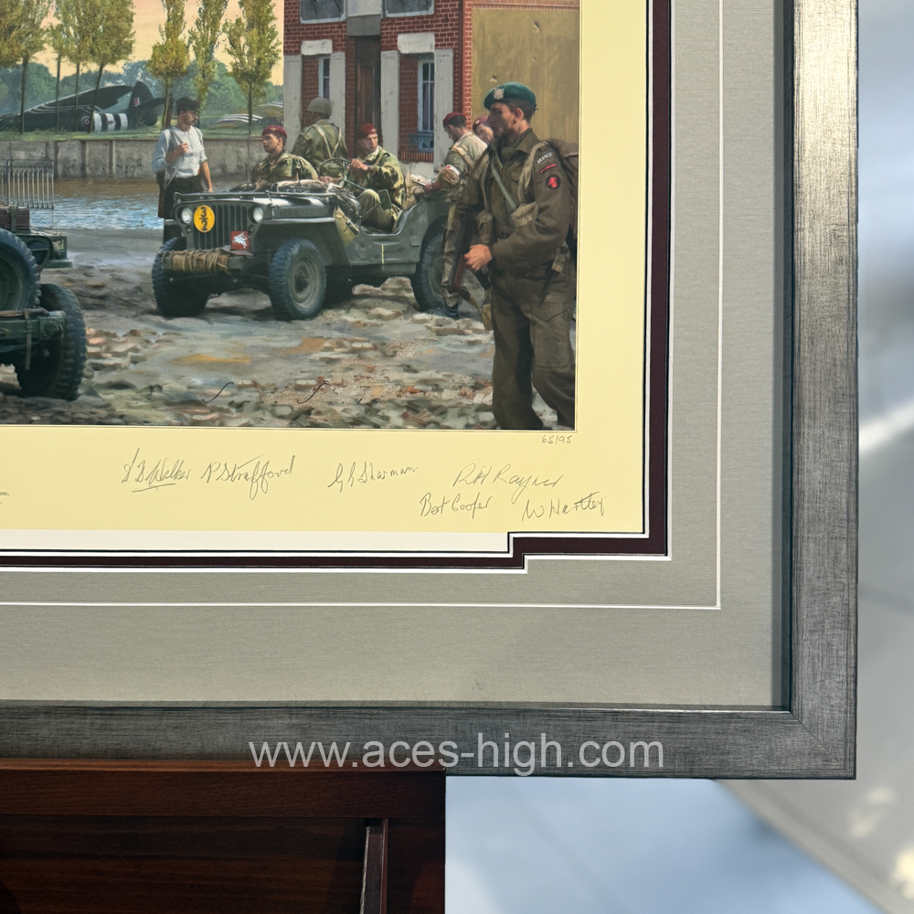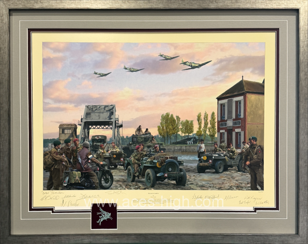 Framed to full conservation standards to include a museum-quality reproduction 6th Airborne Pegasus patch, and to add further authenticity to this edition the print carries the signatures of ELEVEN British veterans: