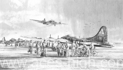 The raid, however, typified the determined resilience of the young American airmen who neither wavered nor flinched, vindicating the Eighth’s campaign of continuous high altitude precision daylight bombing against the Nazi war machine. It is fitting, therefore, that in his beautifully crafted drawing Returning From Schweinfurt, Robert Taylor has chosen a scene from the conclusion of this mission to commemorate all those who served with the Eighth’s Bomb Groups during World War Two.
