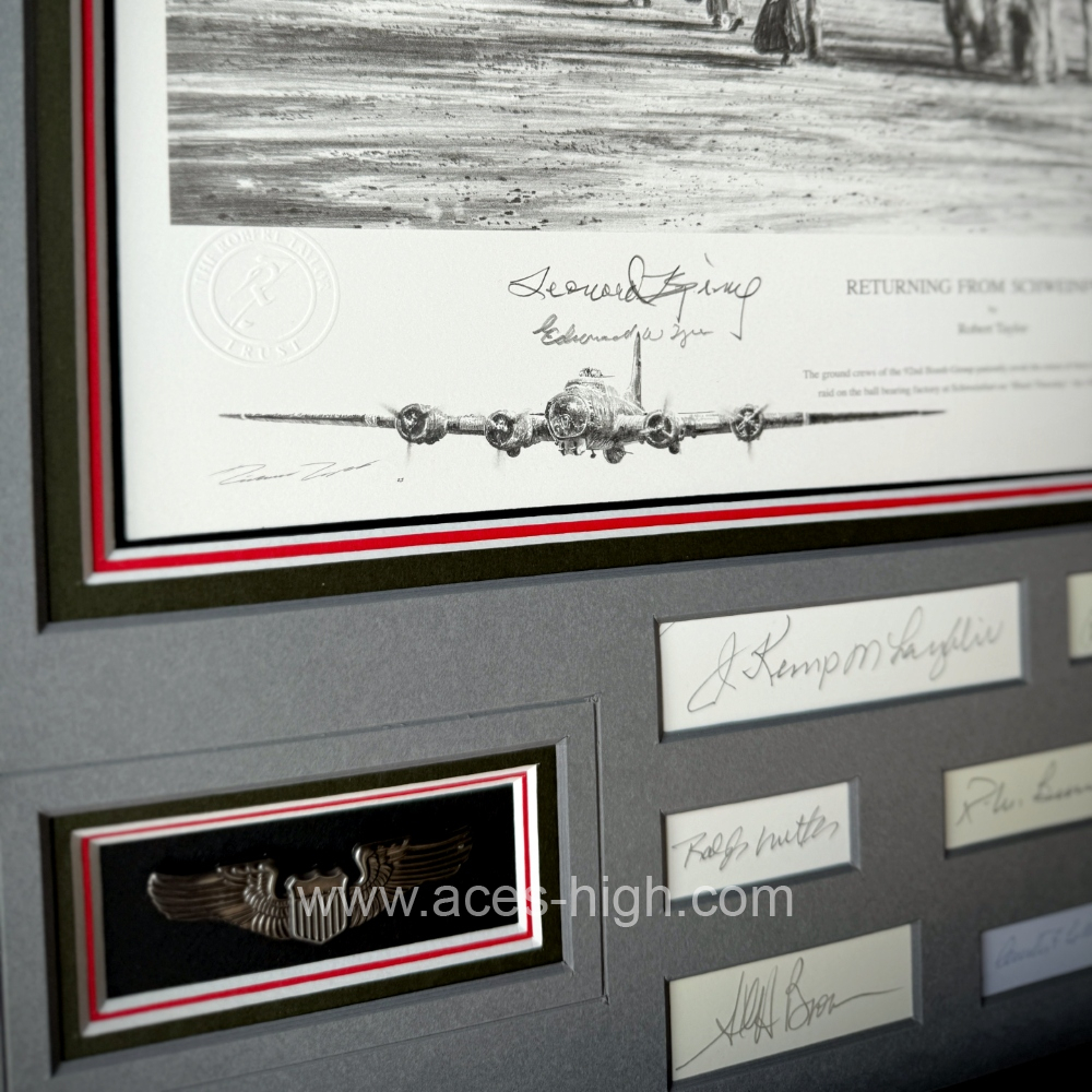 Adding significant historical importance, every copy is issued mounted to full conservation standards to show museum-quality reproduction USAAF pilots wings, an 8th Air Force shoulder patch, and the original signatures of airmen who took part in some of the most significant missions to be carried out by the Mighty Eighth during the war. These include legendary men such as Curtis LeMay who lead the first Schweinfurt-Regensburg mission, his Navigator Ralph Nutter, Kemp McLaughlin who was the Lead Pilot on the second Schweinfurt raid, Robert Shoens who took part in the first USAAF daylight mission to Berlin, and Medal of Honor recipient William Lawley.