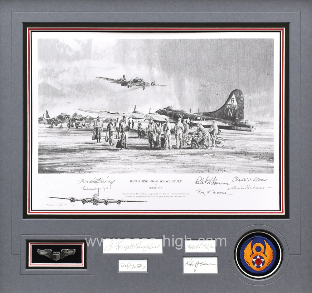 Each print has been personally signed by six B-17 Flying Fortress crewman and conservation mounted to include the original autographs of a further four B-17 Flying Fortress veterans, together with museum quality reproduction USAAF pilots wings and an 8th Air Force shoulder patch: