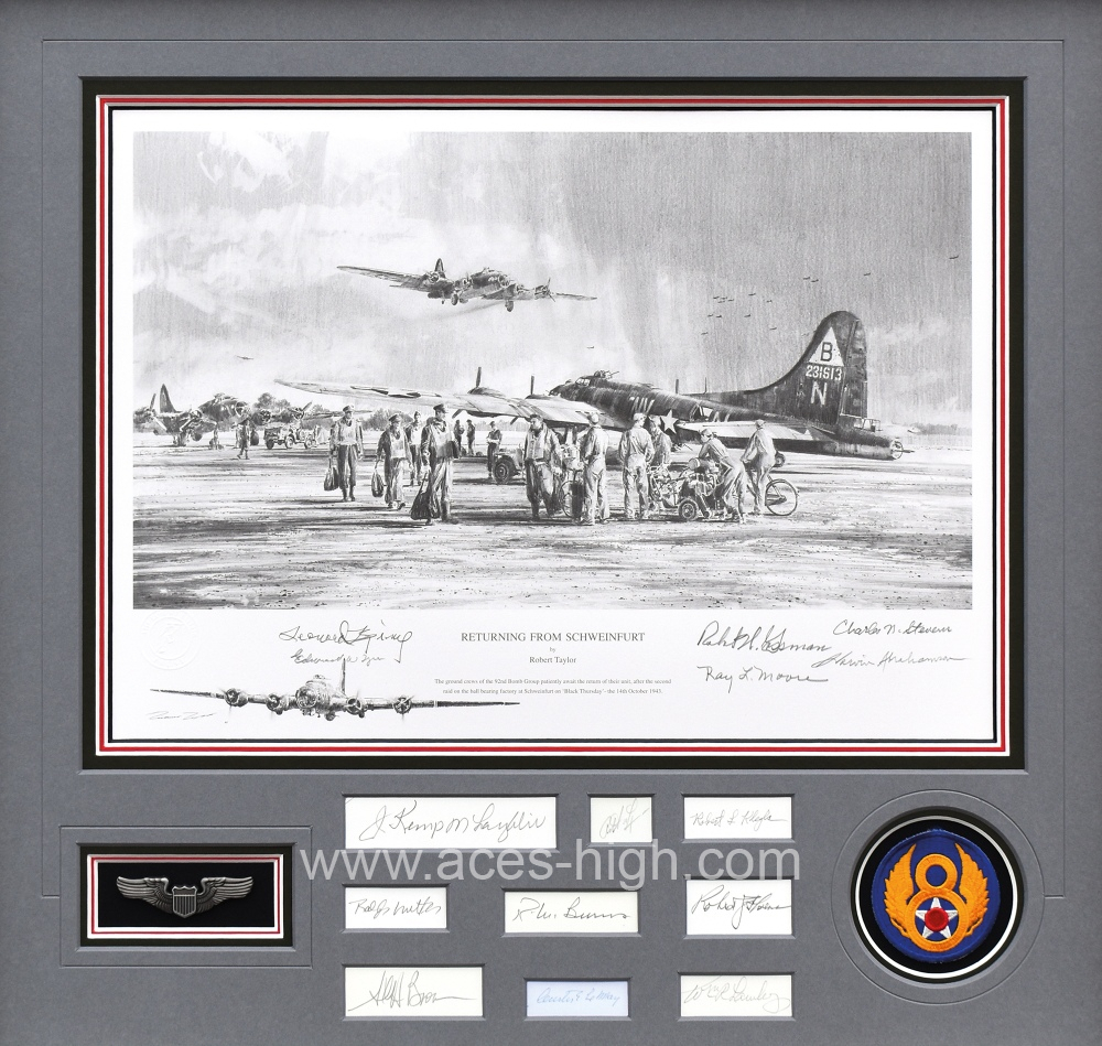 Shown as the endpapers in Robert Taylor’s Air Combat Paintings Volume VI, published in 2009, the Limited Edition print of ‘Returning From Schweinfurt’ was printed that very same year and has since been personally autographed by some of the ever-diminishing band of American bomber crew veterans who flew those frightful combat missions.