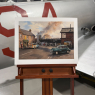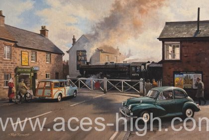 This stunning piece depicts when a steam train passes throigh a small village in an reletively quiet scene with vehicles queing to cross the railway line.