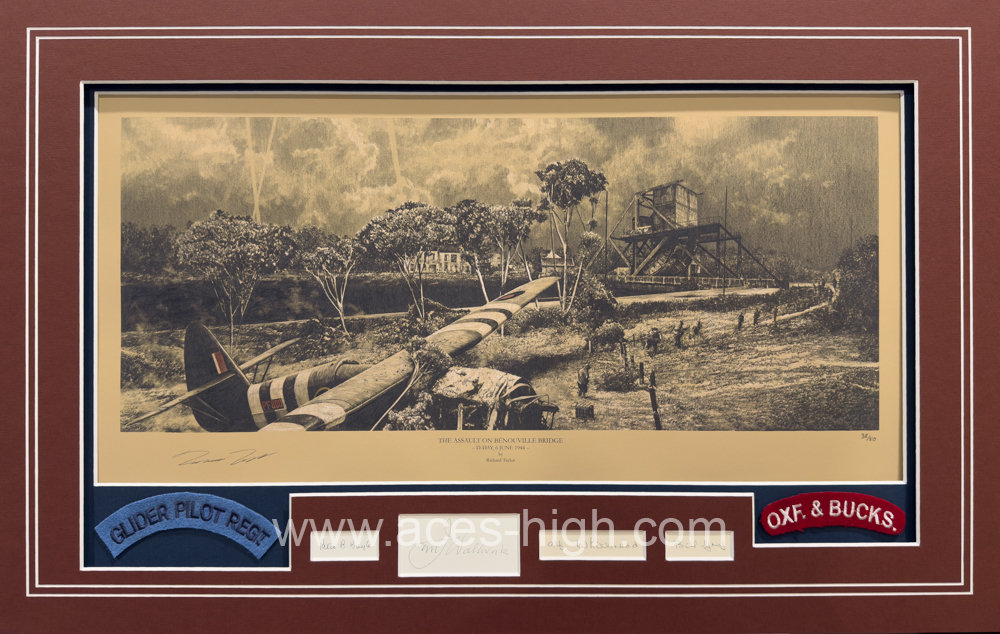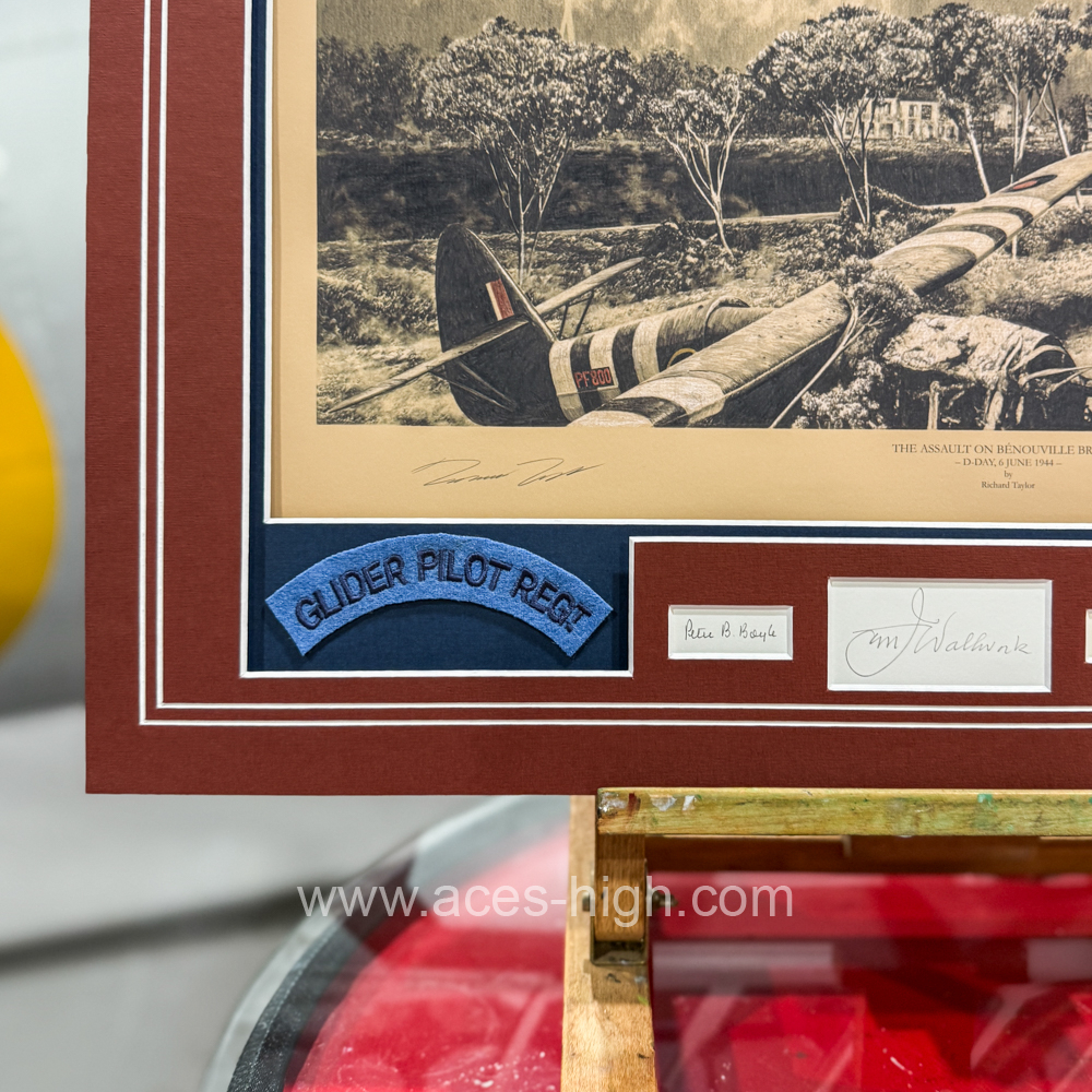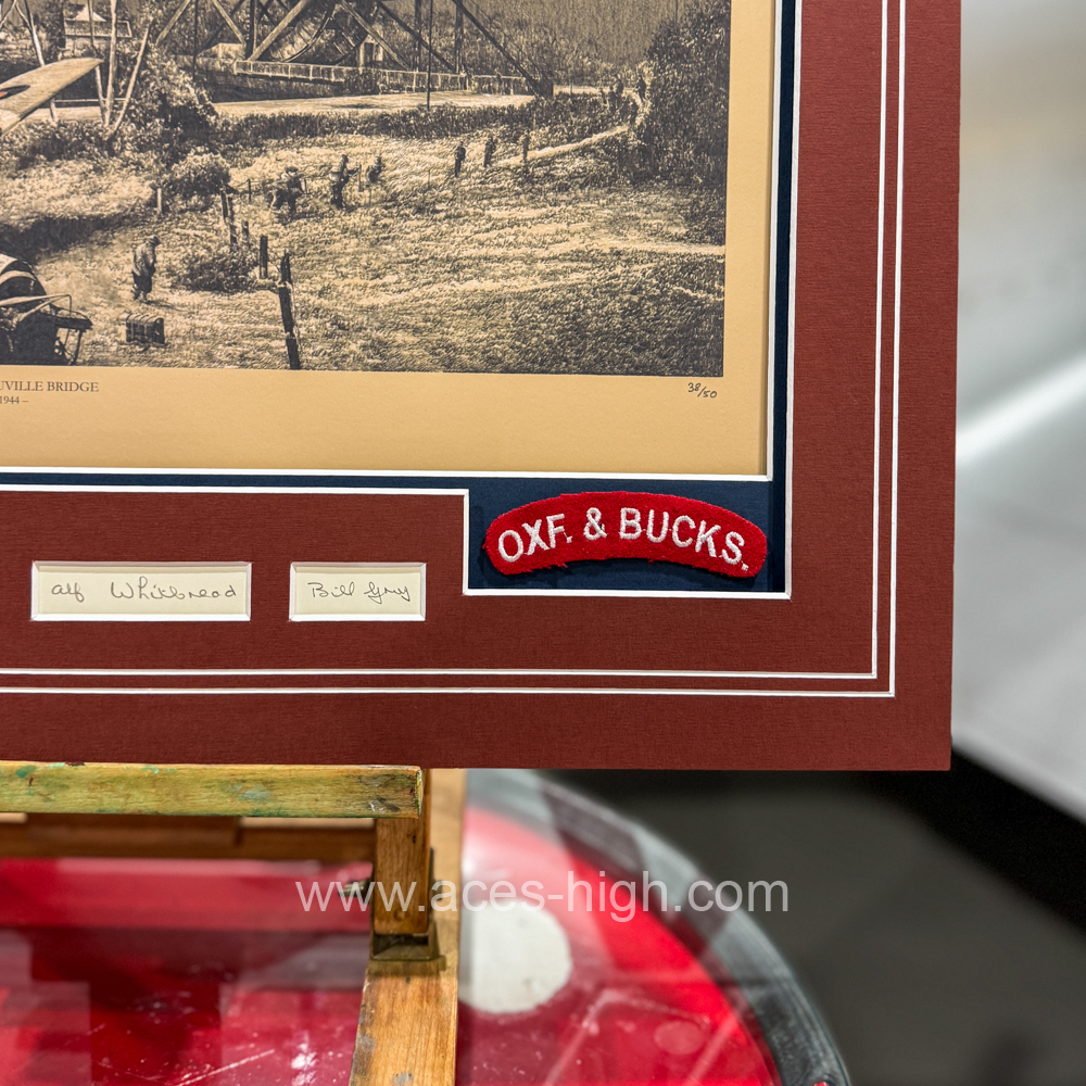 Adding great historical significance, every print is issued mounted to full conservation standards to include museum quality reproduction shoulder titles of both the Glider Pilot Regiment and the Ox & Bucks Light Infantry, PLUS the original pencil autographs of Second World War veterans who took part in the operation, representing both units: