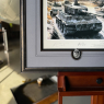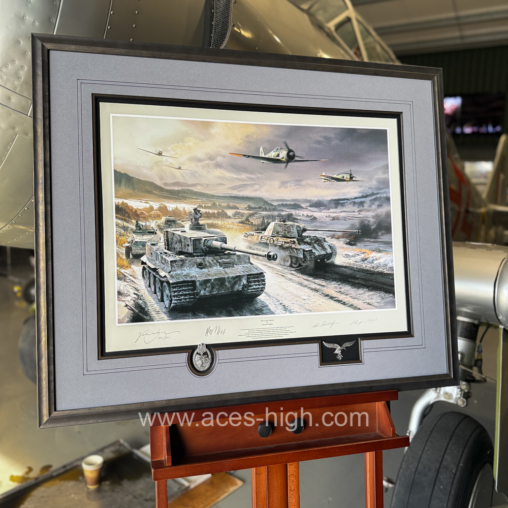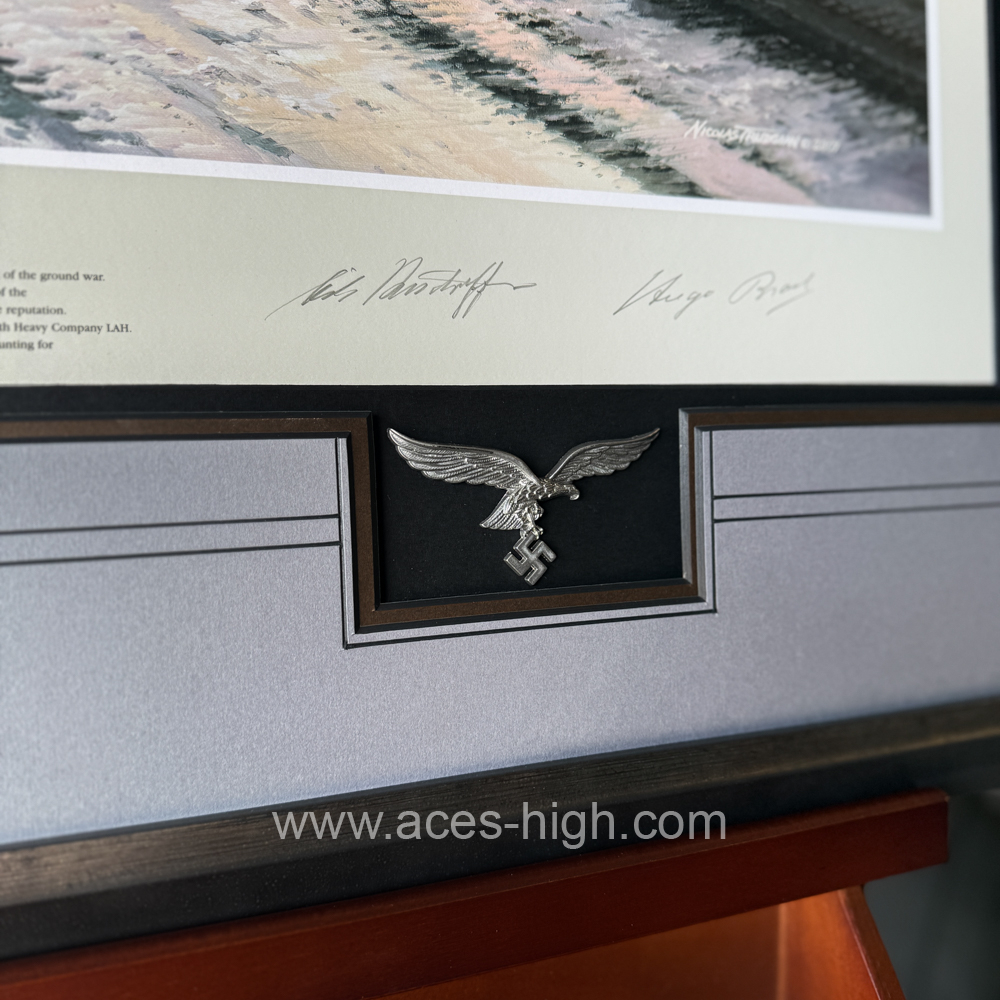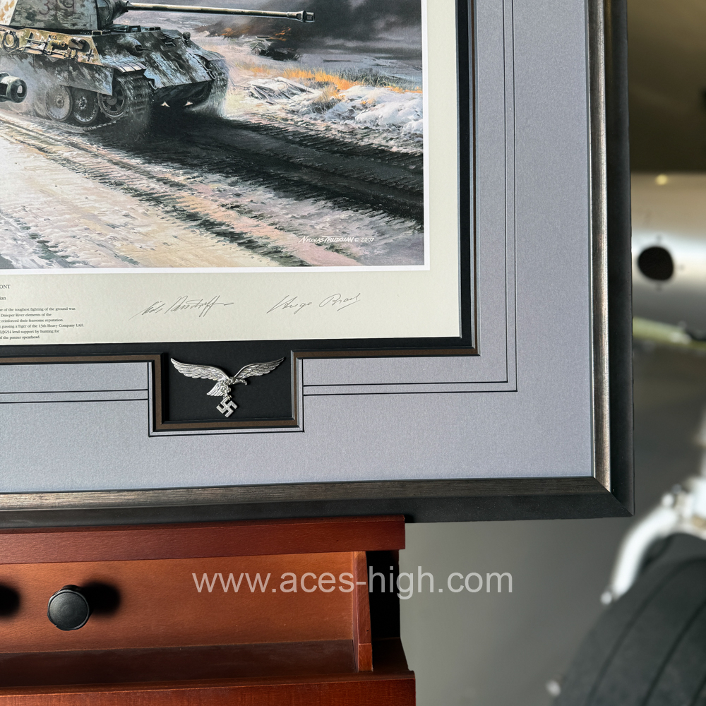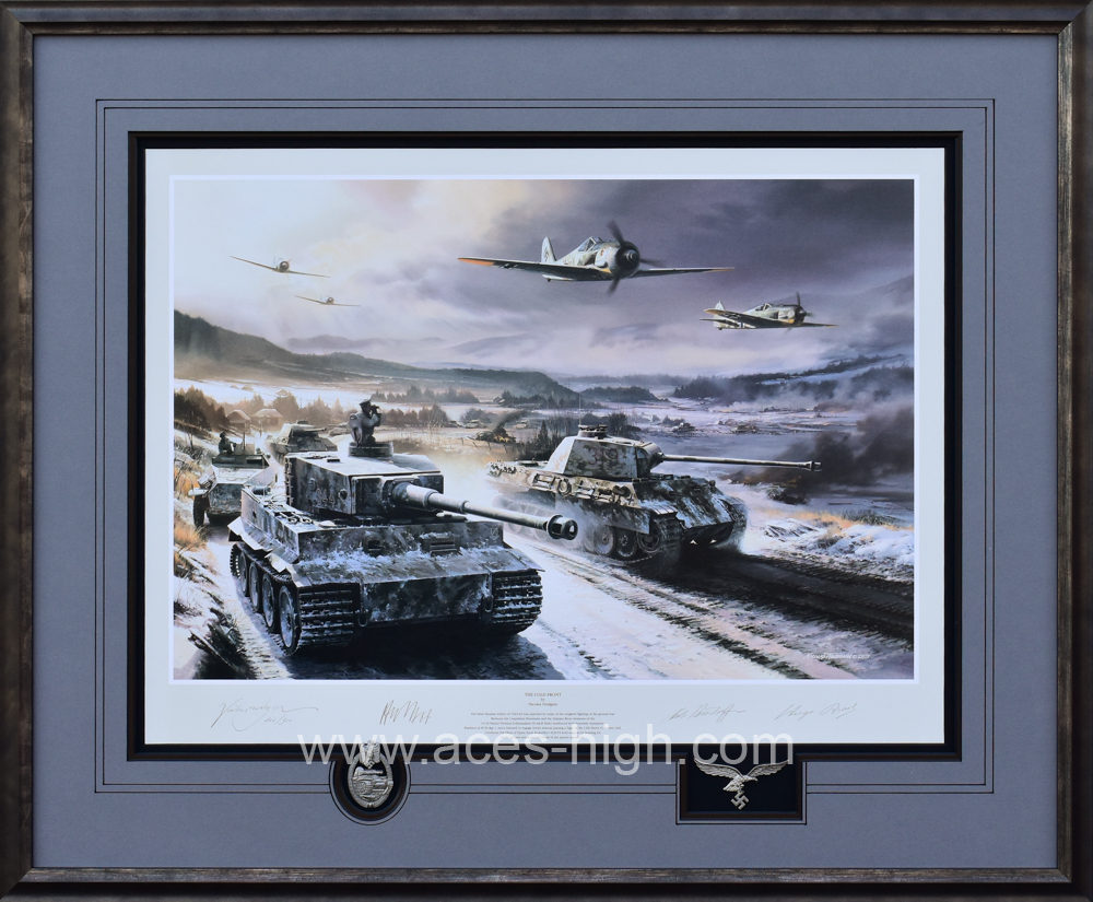 This popular print has been personally signed and authenticated by the Artist and THREE pilots who flew with JG54 and were all awarded the Knight's Cross. PLUS a museum-quality reproduction Panzer Badge and set of Luftwaffe Wings: