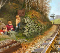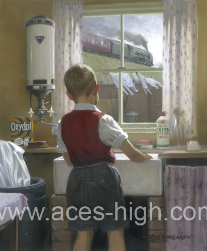 This piece depicts a young boy peering out of the window whilst completing his daily chores watching a stunning stream train roll on by not far from the house he lives in.