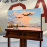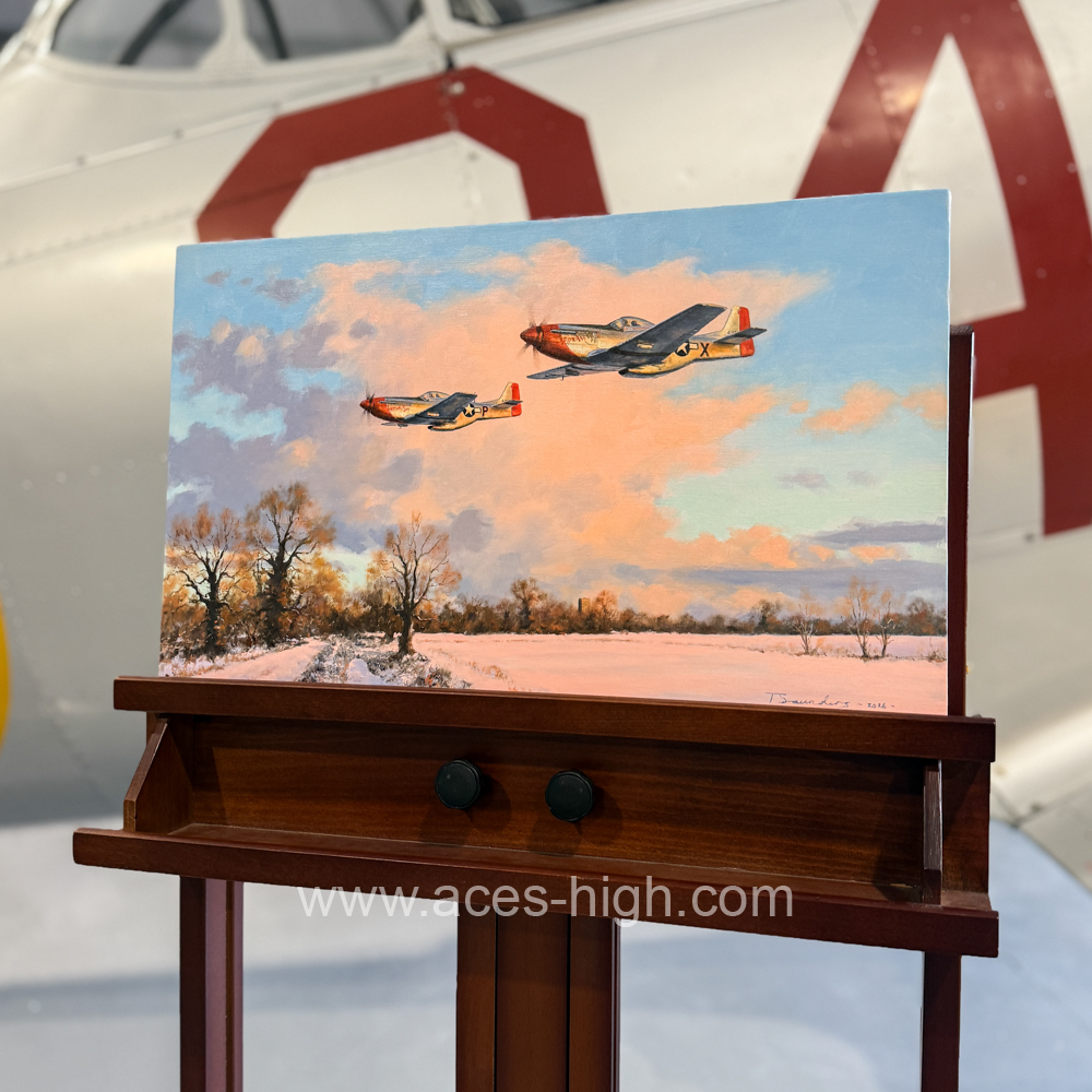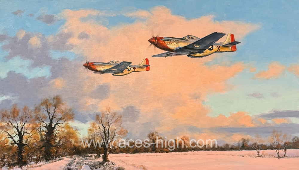 For this painting I wanted to depict two P51s flying low across a winter landscape. I knew red and silver would work perfectly, so I opted for Mustangs of the 4th Fighter Group. The main aircraft is that of Lt. Col. Jack Oberhansly, with his very particular nose art." - Anthony Saunders