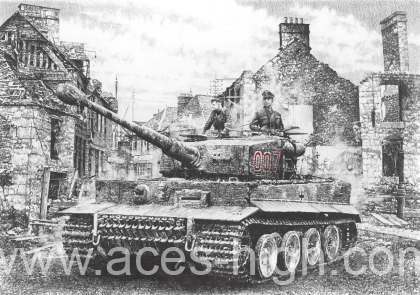 It was here in the village of Villers-Bocage on 13 June 1944 that Wittmann ambushed elements of the British 7th Armoured Division, in the process destroying fourteen tanks, fifteen personnel carriers and two anti-tank guns within the space of 15 minutes. The action gained him the award of Swords to his Knight’s Cross and Oak Leaves. His success, however, was short-lived. On 8 August it was Wittmann’s turn to be ambushed in an apple orchard near Caen, his Tiger destroyed by a bulls-eye hit from a British Sherman Firefly. There were no survivors.