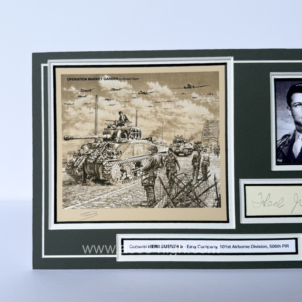 This pencil sketch print by Richard Taylor portrays the moments when Sherman Firefly tanks of the 2nd Irish Guards force their way across the Waal at Nijmegen. Thundering overhead are the C-47s of the 314th Troop Carrier Group carrying the 1st Independent (Polish) Parachute Brigade towards encircled Arnhem.