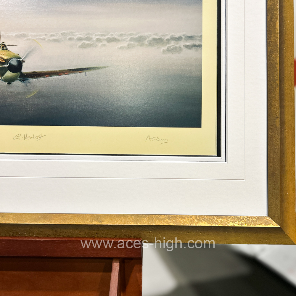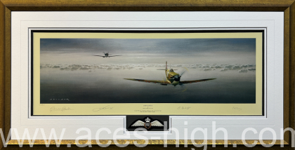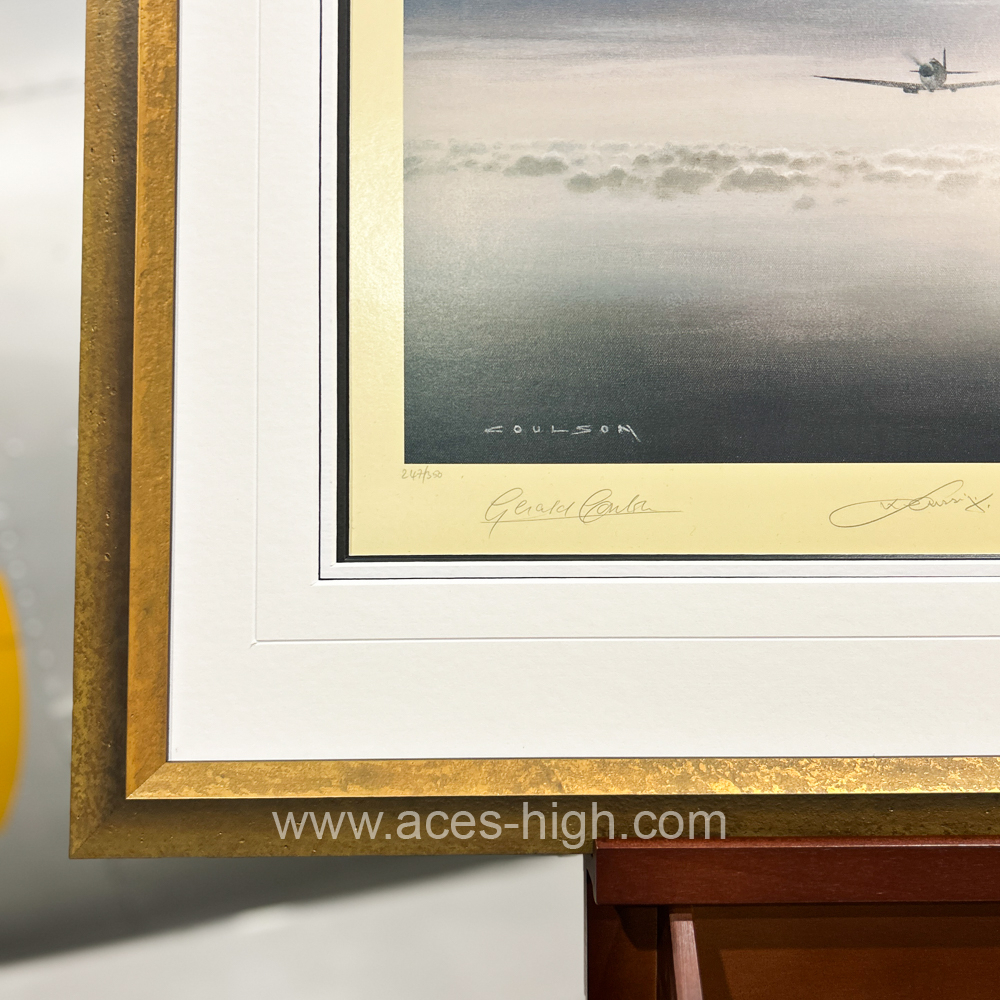 This magnificent tribute to the Spitfire is one of Gerald's best-loved pieces and was personally autographed on release in 2008 by three highly-regarded Spitfire pilots. Framed by our in-house team of expert framers this piece comes signed with the signatures of THREE veterans who flew during the Battle of Britain.
