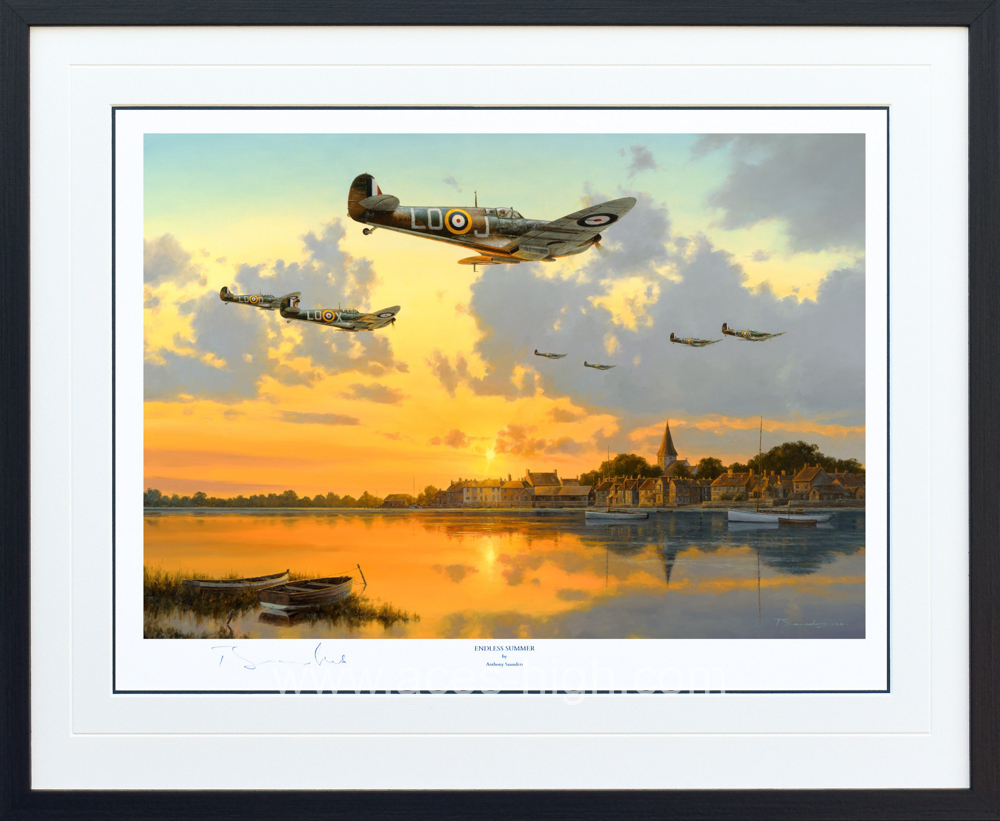 Amongst those defending Portsmouth was 602 Squadron, the unit chosen by renowned artist Anthony Saunders to take centre stage in his dramatically beautiful painting Endless Summer. Led by their inspirational CO, Squadron Leader Sandy Johnstone, Anthony portrays them on their way back to base having successfully intercepted a large force of Ju88s. With the sun slowly dropping in the evening sky they are nearly home; the rooftops of the ancient village of Bosham and the still waters of Chichester Harbour a welcoming sight for the weary warriors.