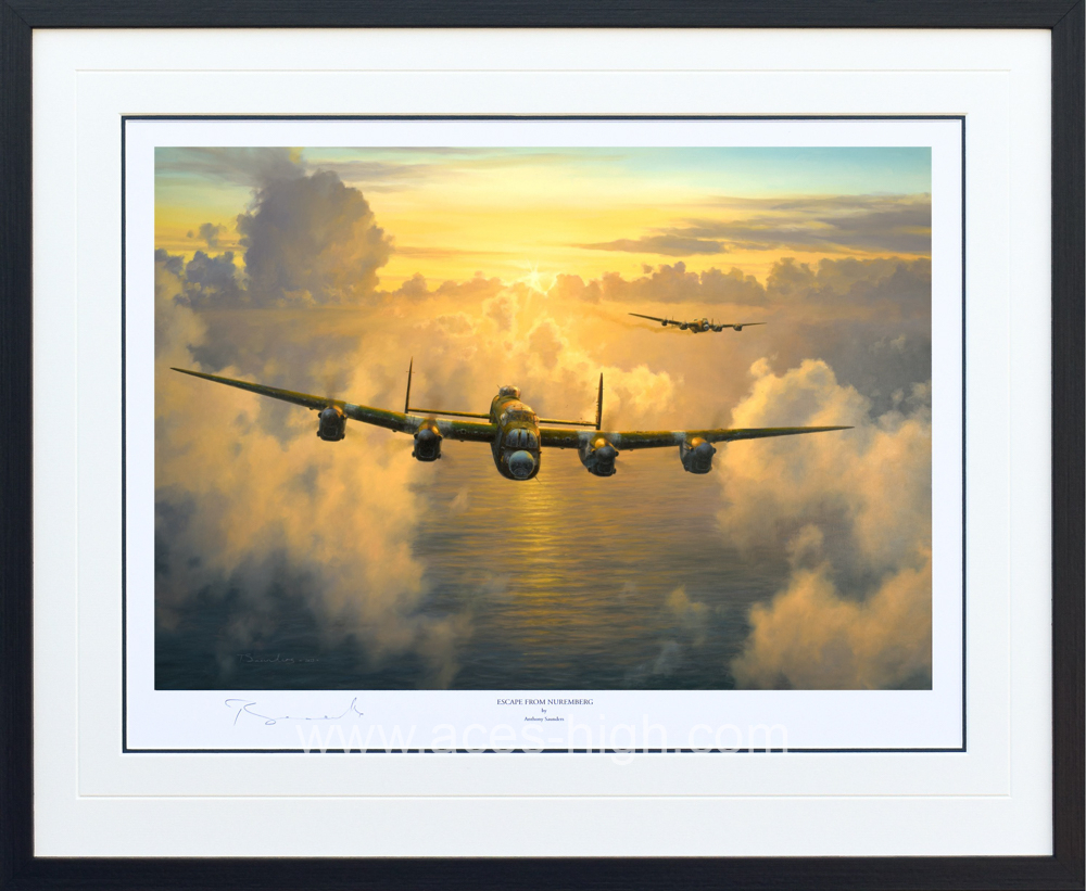 Anthony Saunders’ dramatic painting Escape from Nuremberg glows with authenticity as a pair of badly damaged 97 Squadron Lancasters struggle back to base after the raid. As the first rays of the rising sun glint across the surface of the North Sea below it won’t be long before the weary crews are safely on the ground.