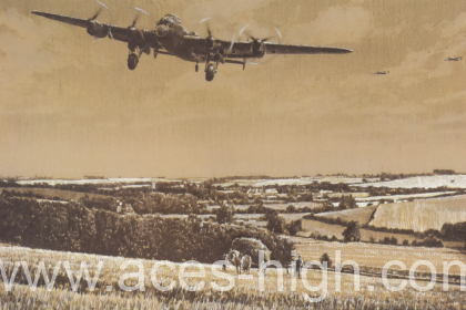 The task of haymaking is briefly interrupted as a flight of Lancaster bombers, having carried the night-bomber offensive deep into the heart of Germany, return safely from a long, arduous mission. The steady pitch of the four great Merlin engines changes as the battle-weary pilot, eyes rimmed red with exhaustion, eases back on the throttle to makes the final approach to the nearby airfield.