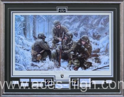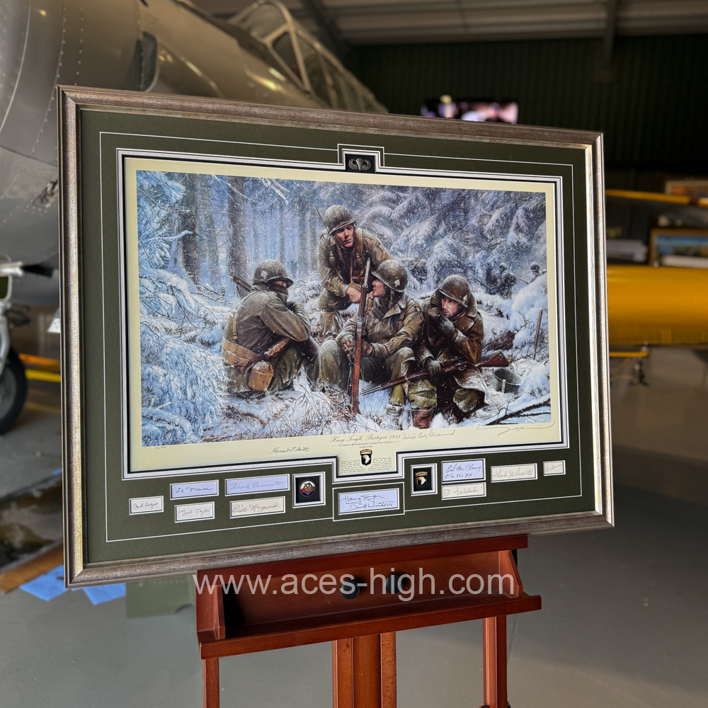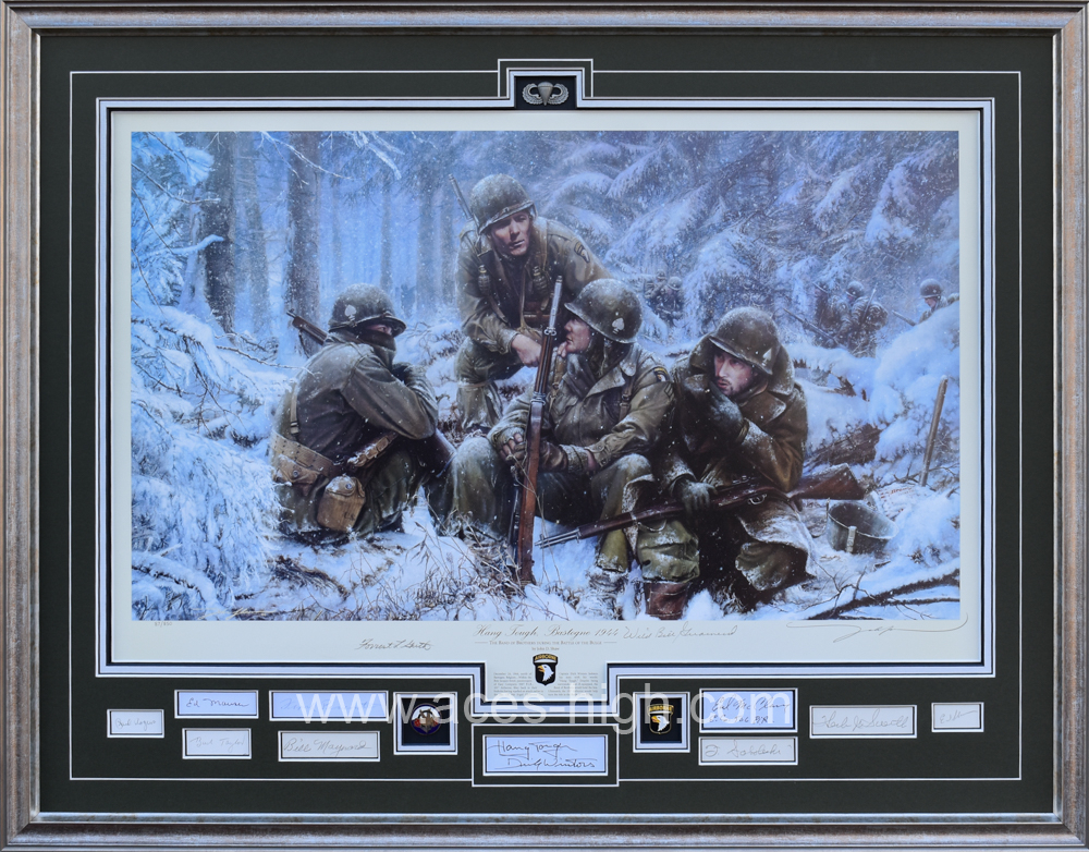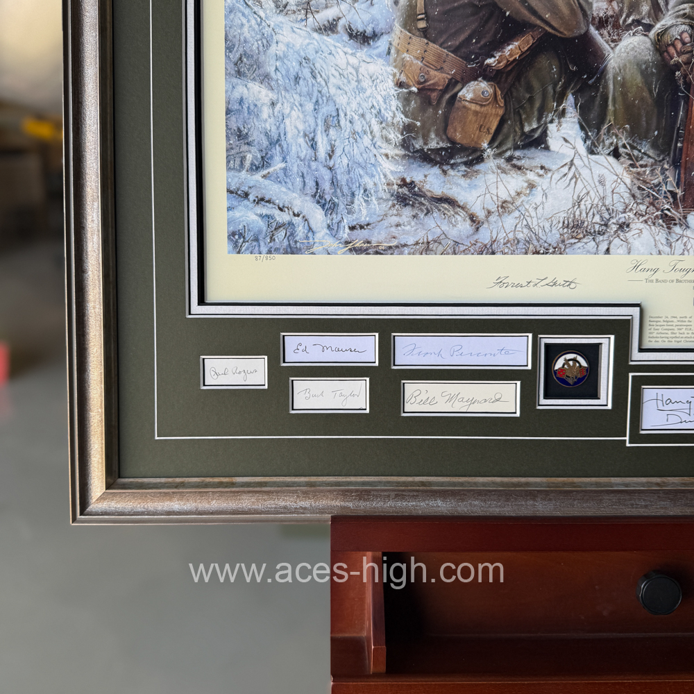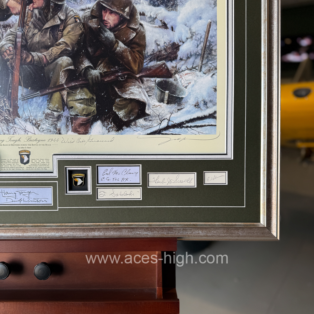 Now extremely sought after, this powerful piece includes TWELVE Easy Company autographs, including the likes of ‘WILD BILL’ GUARNERE, 'BABE' HEFFRON and their mercurial leader RICHARD 'DICK' WINTERS! As well as museum quality reproduction Combat Infantryman, 506th PIR and 101st Airborne pin badges.