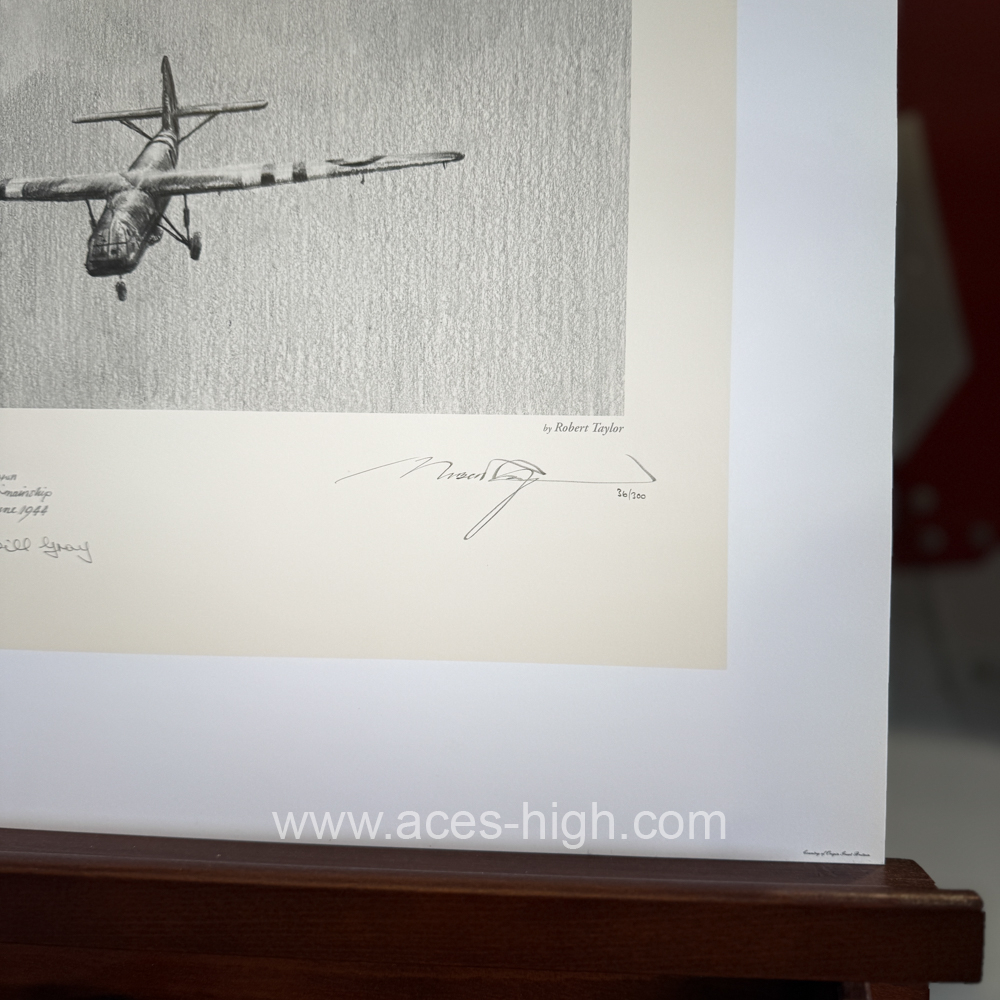 This graphite edition from the master aviation artist is another tribute to the men that fought for during D-Day and carries a superb line up of original signatures of veterans who fought in the epic encounter at Pegasus Bridge, assaulted the beaches and one of the six Halifax pilots who towed the gliders into action on that momentous night.