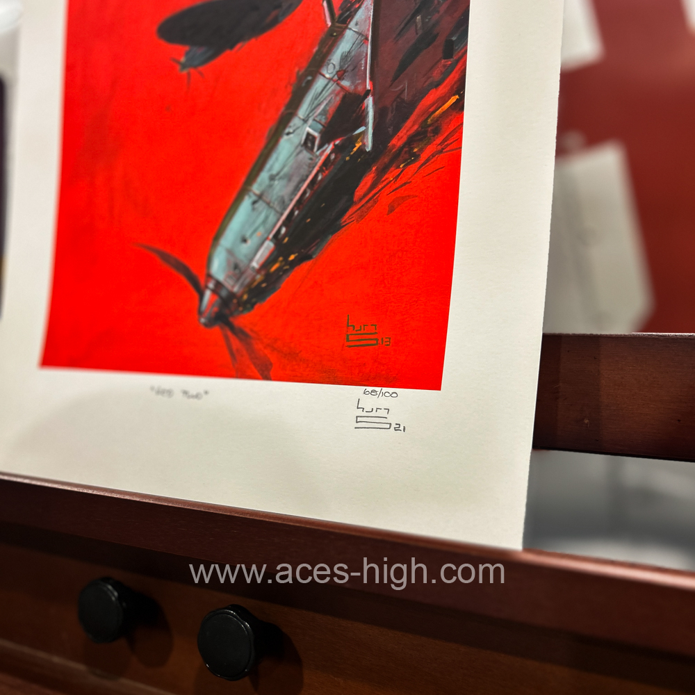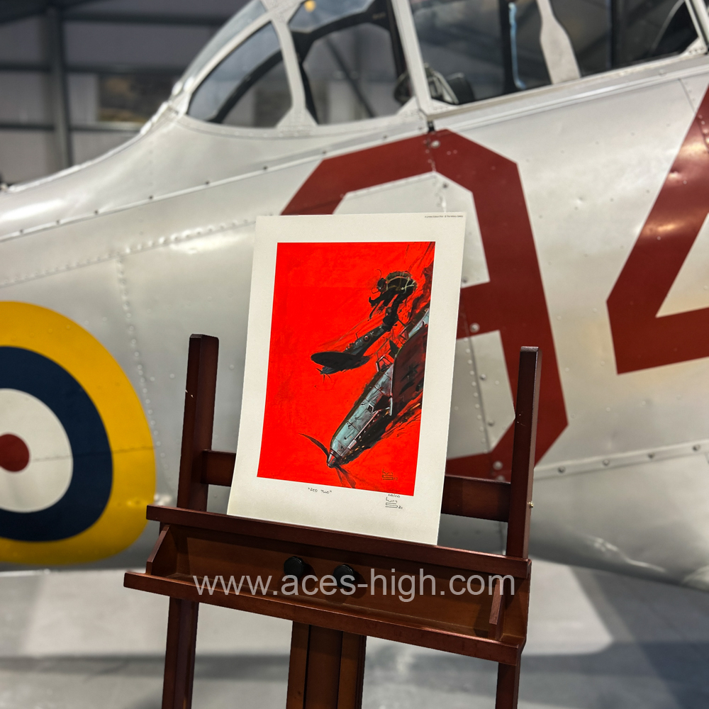 Keith’s dramatic painting takes us to an incident over occupied northern France during the hectic fighting in that summer of 1944 as Squadron Leader John Plagis, Commanding Officer of 126 Squadron and former Malta veteran, notches up yet another impressive victory, this time over a Messerschmitt Bf109.