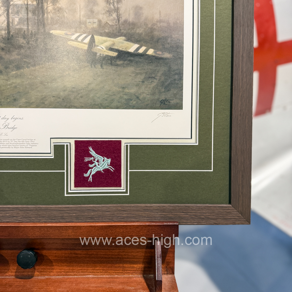 It's not often we're able to offer this moving piece. Framed to full conservation standards, our expert team have included patches of the Ox & Bucks and Winged Pegasus insignia as worn by the 6th Airborne Division, and to make it even more special it has been signed by a veteran of Pegasus Bridge who landed in Glider No.4: