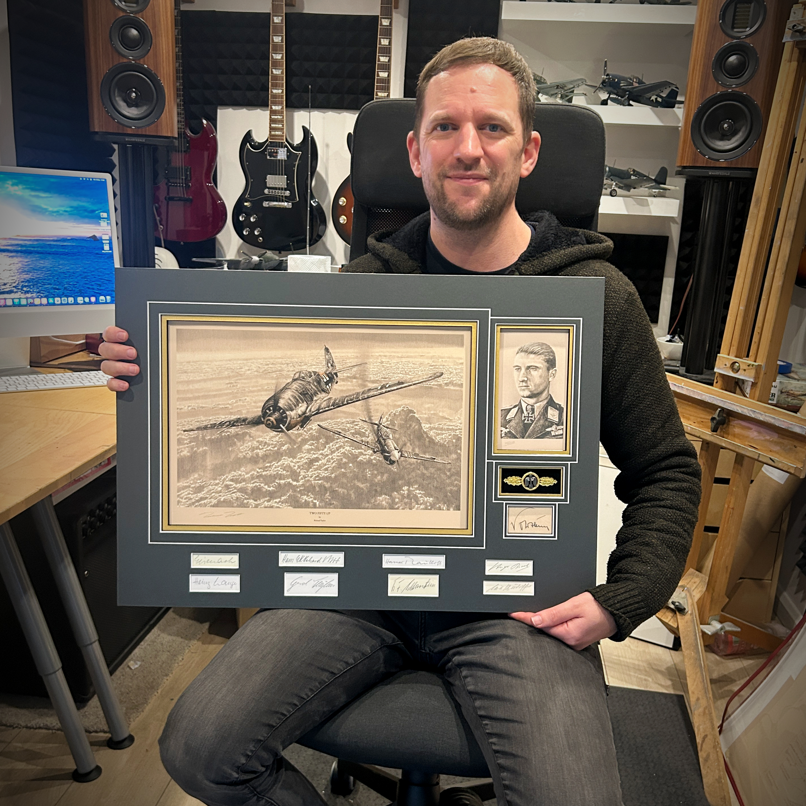 That historic moment is captured by Richard Taylor in a dramatic depiction of Nowotny’s encounter with a Soviet Curtiss P-40. Not only was the P-40 number 250 but the culmination of four victories in just twenty minutes! Faithfully reproduced as a high quality giclée fine art print on archival paper, each copy hand-numbered and personally signed by Richard Taylor. Alongside the print are original autographs from nine JG 54 fighter pilots, all confirmed aces, including the exceptionally rare signature of Walter Nowotny.