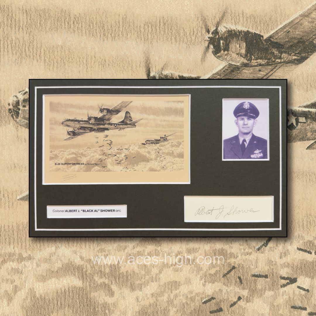 Albert Shower was awarded the Distinguished Flying Cross for extraordinary achievement while participating in aerial flight while serving as Commanding Officer, 467th Bombardment Group and was the only Group Commander in the Eighth Air Force to bring a Group to the UK and to command it until the end of hostilities. His dedication and leadership on 30 missions, gave the 467th Bomber Group the best overall standing for bombing accuracy in the Eighth Air Force. Flying predominantly the B-24 Liberator and towards the latter part of the war, the new Boeing B-29 Superfortresses.