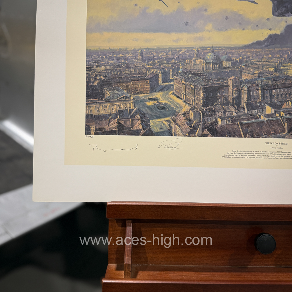 Anthony Saunders' dramatic painting pays tribute to this pivotal moment in the war when RAF Mosquito's carried out their first two daylight raids on Berlin to disrupt major speeches by Goering and Goebbels. His masterful brush brings the scene into vibrant, spectacular life with painstaking attention to detail, capturing the Mosquito B.Mk.IVs of 105 Sqn departing the target area, following their successful strike on the Haus des Rundfunk.