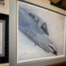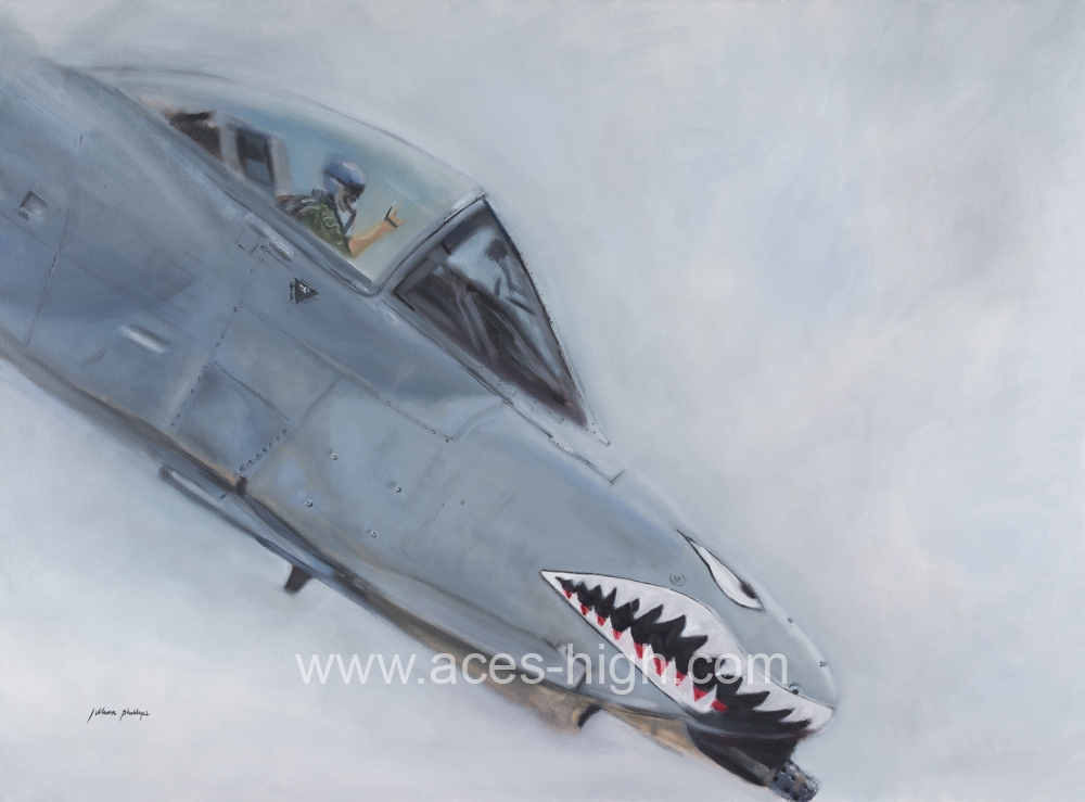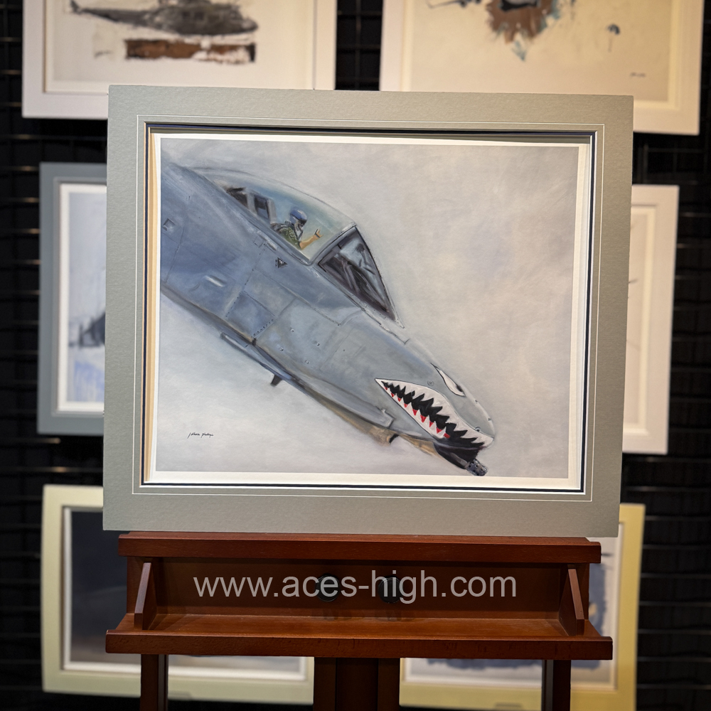 This premium print depicts the cockpit of an A-10 Thunderbolt II with remarkable detail and texture, rendered using classical fine art technique. The grey background provides a neutral contrast that enhances the intricate lines and instruments within the cockpit, emphasizing the rugged, utilitarian design of this iconic close air support aircraft. The muted tones of the aircraft controls and canopy frame stand out against the smooth grey, conveying the strength and resilience associated with the A-10. This artwork captures both the mechanical complexity and the purposeful simplicity of the cockpit environment, making it a compelling piece for military aviation enthusiasts.