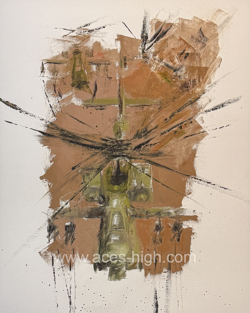 The Apache, rendered with bold, textured strokes from the palette knife, reveals its unmistakable, predatory form as it emerges from the canvas. Its angular surfaces catch the muted earth tones, echoing the rugged environments it was built to command. The composition remains minimalist yet powerful, distilling the helicopter to its essential geometry and the legacy it carries in modern military aviation. The overall effect is one of poised intensity, inviting the viewer to appreciate both the artistry and the enduring significance of this formidable aircraft.