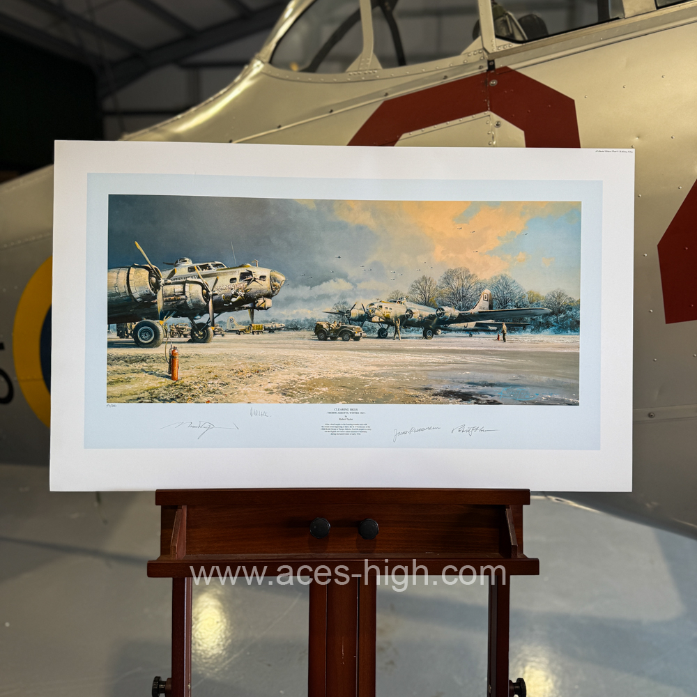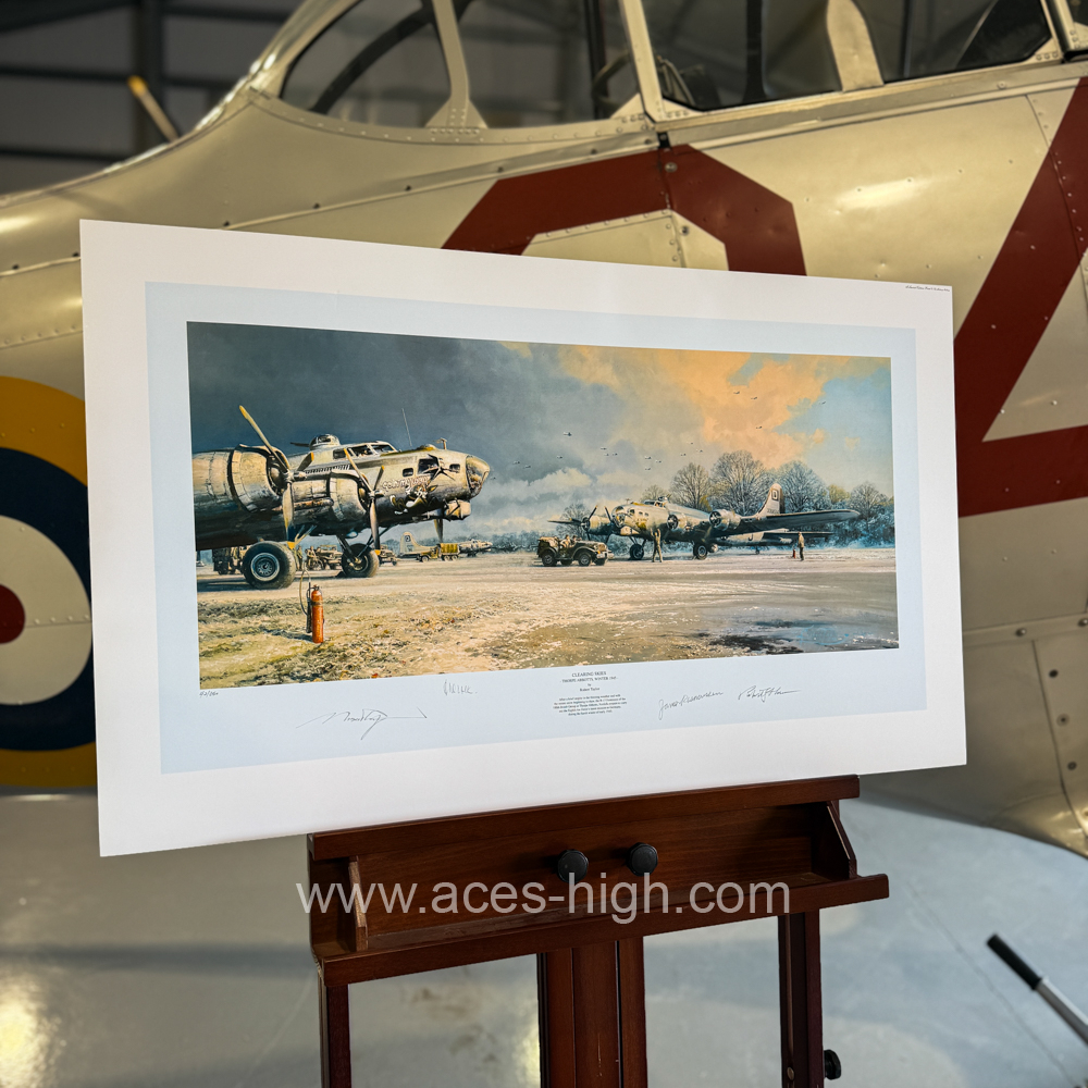 Bearing all the hallmarks of a classic Robert Taylor masterwork, this outstanding piece portrays one such break in the weather when, with recent heavy snow beginning to thaw, the B-17 Fortresses of the famous 100th Bomb Group at Thorpe Abbotts in Norfolk are being prepared for a new mission to Germany in early 1945.