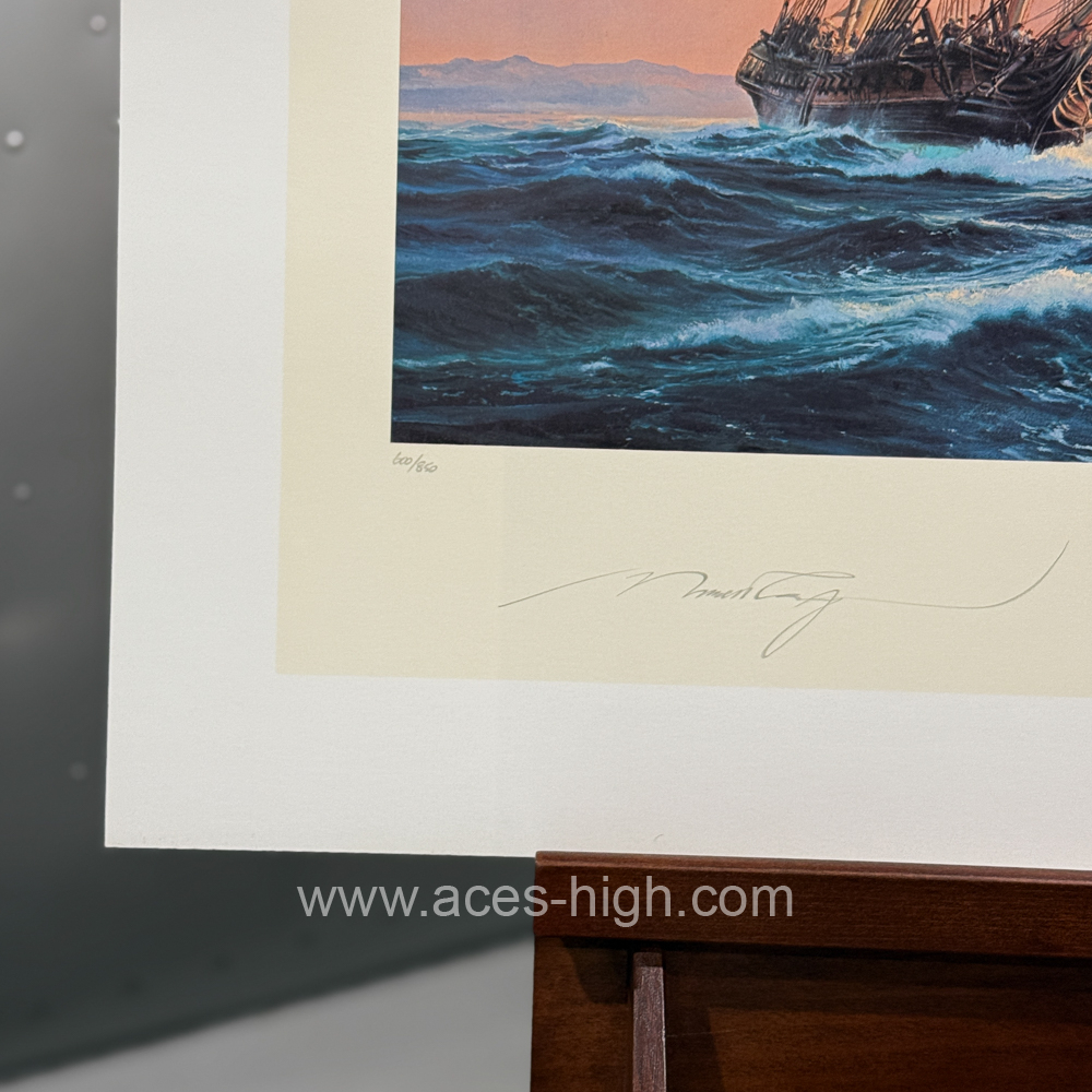 Robert Taylor, a maritime painter of extraordinary ability, was also inspired when he created ‘Hornblower & the Indefatigable’, capturing with great authenticity the duel between the young midshipman’s frigate and a French frigate.As the eighteenth century drew to a close, the young midshipman Hornblower found himself assigned to the Royal Navy frigate HMS Indefatigable on blockade duty off the west coast of France, ready to pounce on any French ship unwise enough to venture out to sea. Tossed around in stormy seas it was a cold, wet and uncomfortable billet for the sailors of the Royal Navy, but when called into action no one fought better. Such was occasion when Hornblower’s frigate, commanded by Captain Pellew, caught a larger 40-gun French frigate attempting to break out one cold January day. With yards groaning and gun trucks squealing, the determined Captain Pellew lays his ship close to the wind and engages the Frenchman. Needless to say the Royal Navy was triumphant, the enemy was boarded and taken as a prize of war.