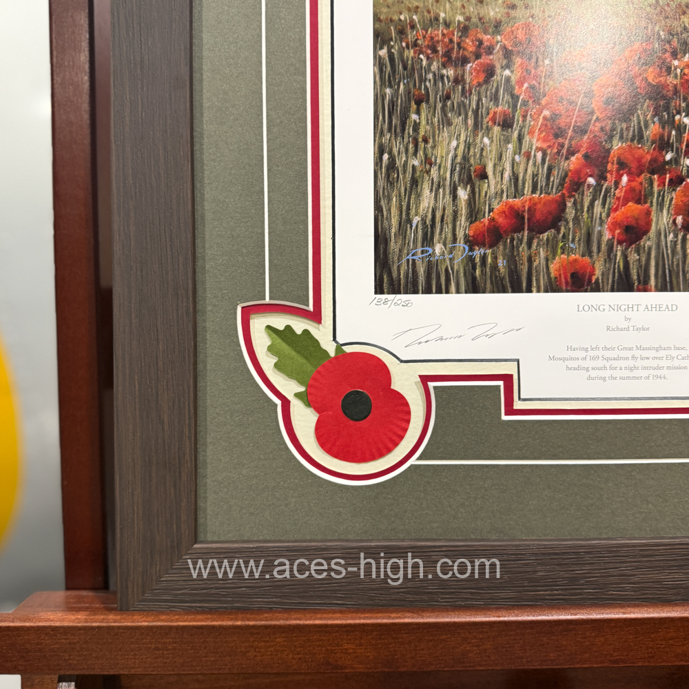 Framed to full conservation standards with UV99 Artglass to include a Remembrance Poppy in the lower margin of the mount, and along with the artist, this memorable print has been personally signed by a highly regarded Mosquito Navigator who flew many critical combat missions during World War II: