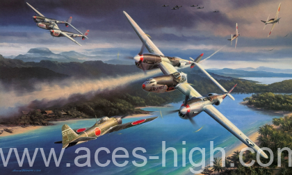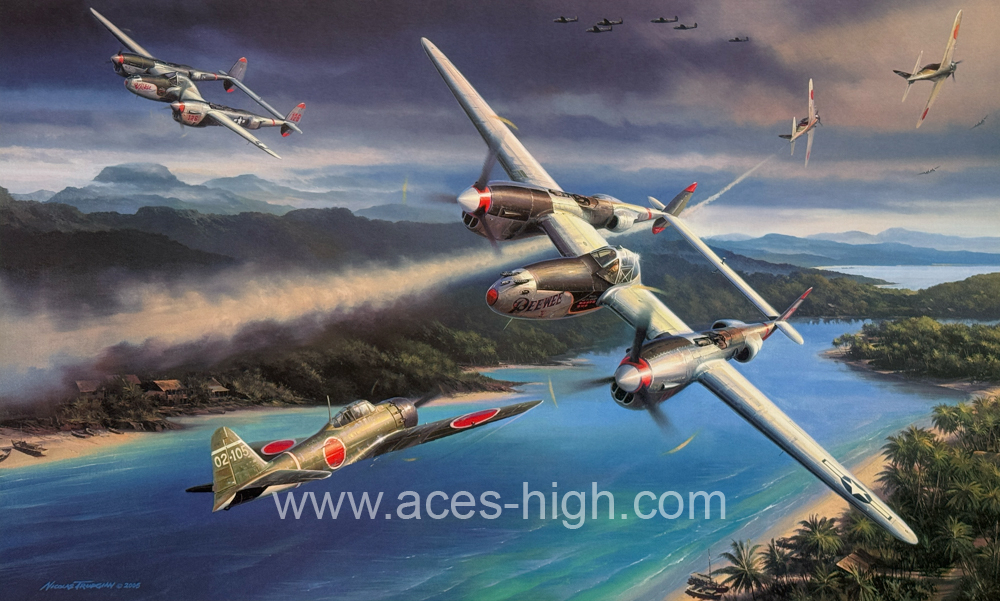 One of the most successful of the P-38 equipped units was the 475th Fighter Group, Satans Angels, and it is the P-38s of this famous unit that Nicolas Trudgian has portrayed in his tribute to the American Air Forces that made Victory in the Pacific possible. It is March 1945 and the P-38s of the 475th FG are involved in a huge dogfight with Japanese Zeros over the coast of Indo-China. Flying Pee Wee V is Lt Ken Hart of the 431st Fighter Squadron, who has fatally damaged a Zero in a blistering head on encounter. The second P-38 - Vickie - belongs to Captain John Rabbit Pietz, who would end the War an Ace with six victories.
