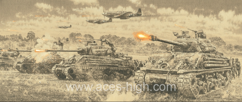 In his unmistakable style, internationally acclaimed military and aviation artist Richard Taylor has created this historic tribute to a name that has gone down in military folklore. He skilfully depicts a scene in late March 1945 as elements of Patton’s Third Army rapidly advance having recently crossed the Rhine River at Oppenheim, south of Mainz. Patton’s favoured strategy of speed and aggressive offensive action is clearly visible as fast-moving elements of the U.S. 6th Armoured Division launch a blistering attack on German infantry retreating east towards Frankfurt and ever deeper into the heartland of Hitler’s failing Reich. One further nail had been embedded in the Nazi coffin.