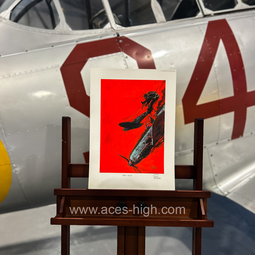 Keith’s dramatic painting takes us to an incident over occupied northern France during the hectic fighting in that summer of 1944 as Squadron Leader John Plagis, Commanding Officer of 126 Squadron and former Malta veteran, notches up yet another impressive victory, this time over a Messerschmitt Bf109.