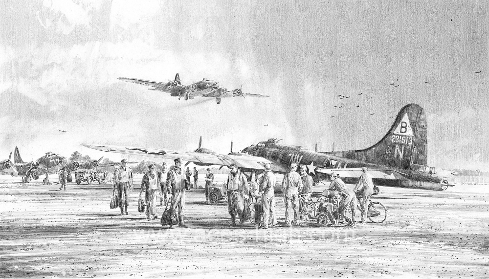 The raid, however, typified the determined resilience of the young American airmen who neither wavered nor flinched, vindicating the Eighth’s campaign of continuous high altitude precision daylight bombing against the Nazi war machine. It is fitting, therefore, that in his beautifully crafted drawing Returning From Schweinfurt, Robert Taylor has chosen a scene from the conclusion of this mission to commemorate all those who served with the Eighth’s Bomb Groups during World War Two.