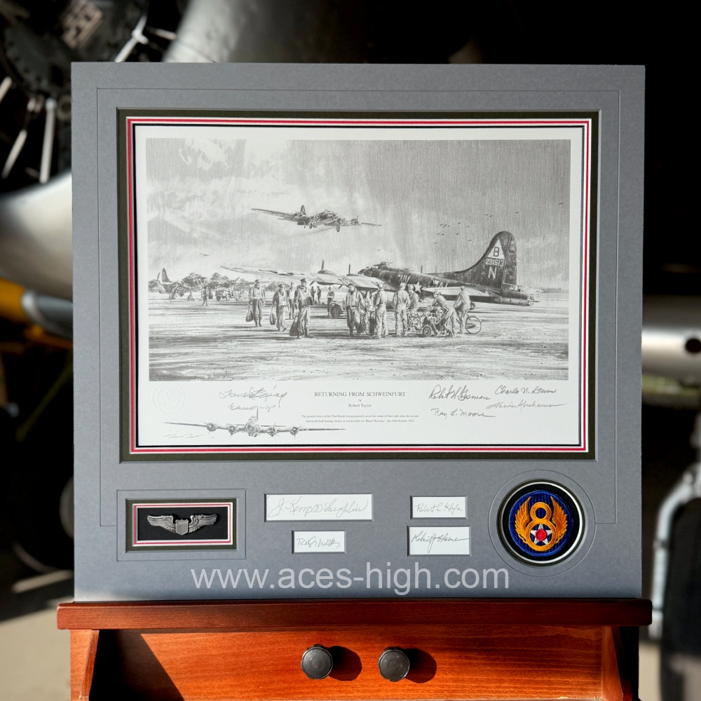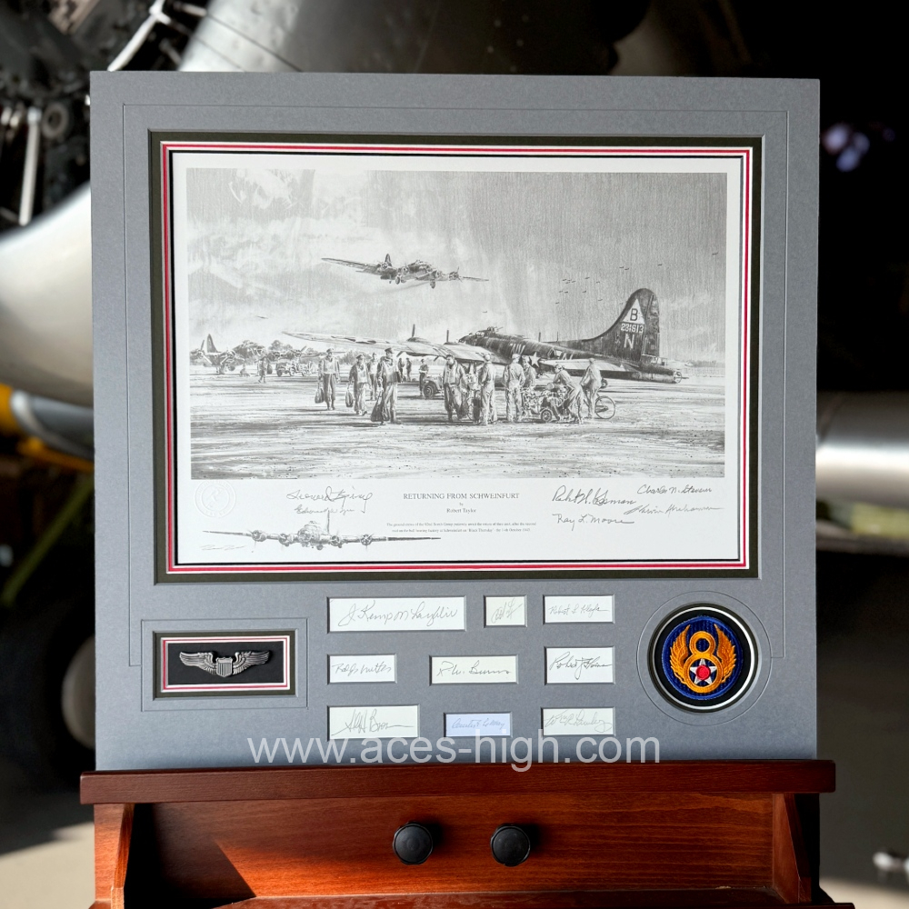 Shown as the endpapers in Robert Taylor’s Air Combat Paintings Volume VI, published in 2009, the Limited Edition print of ‘Returning From Schweinfurt’ was printed that very same year and has since been personally autographed by some of the ever-diminishing band of American bomber crew veterans who flew those frightful combat missions.
