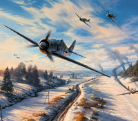 In ‘Stalingrad’, Me 109Gs of JG3 tenaciously protect He111s of KG55 and Ju52s of KGrzbV 9 from the attacking Soviet Yak 1Bs during one of those desperate supply missions over the smoking ruins of the city. The Luftwaffe's efforts to maintain contact with their ground forces enabled between 25,000 - 40,000 wounded men to escape the trap. Ultimately, however, the Germans were defeated and their failure to capture Stalingrad was subsequently seen as the most significant turning point of the war on the Eastern Front.