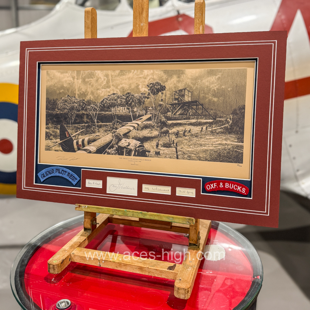 Adding great historical significance, every print is issued mounted to full conservation standards to include museum quality reproduction shoulder titles of both the Glider Pilot Regiment and the Ox & Bucks Light Infantry, PLUS the original pencil autographs of Second World War veterans who took part in the operation, representing both units: