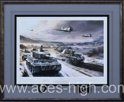 In 'The Cold Front', Panthers of SS. Pz Regt 1 move forward to new positions from where they can seek out Soviet Armour, passing by a stationary Tiger of the 13th Heavy Company LAH, whose commander scrutinises the unfamiliar and treacherous valley ahead. Lit by a fleeting shaft of sunlight, Fw190A's of Hptm Erich Rudorffer's II/JG54 roar overhead, hunting for Soviet ground attack aircraft that would threaten this Panzer spearhead. Sadly, despite the caution of its commander, Tiger 'S44' would be one of the many tanks lost by both sides before the winter thaw set in.