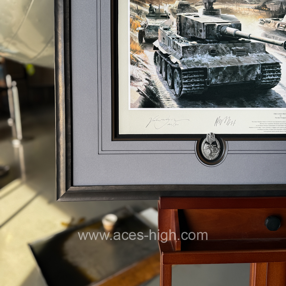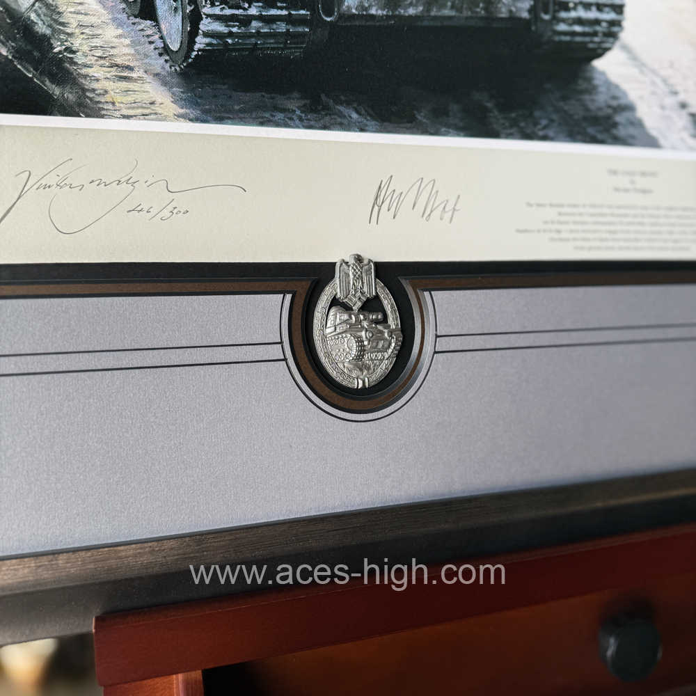 This popular print has been personally signed and authenticated by the Artist and THREE pilots who flew with JG54 and were all awarded the Knight's Cross. PLUS a museum-quality reproduction Panzer Badge and set of Luftwaffe Wings: